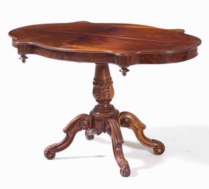 Tavolo a biscotto lastronato in piuma di mogano, XIX secolo