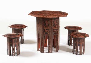 Tavolino vittoriano con 4 sgabelli in olmo cinese