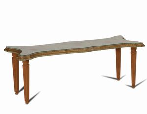 Tavolo in legno intagliato, dipinto e piano in vetro, XX secolo