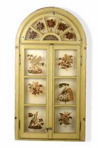 Coppia di vetrate con struttura in legno laccato e vetri dipinti a motivi floreali [..]