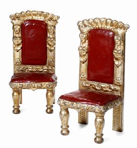 Coppia di modellini di poltroncine in legno intagliato e dorato, XVIII secolo