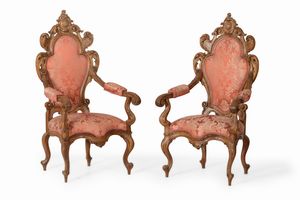 Coppia di poltrone in legno intagliato. XVIII secolo