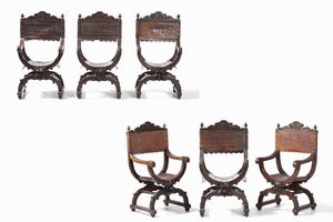 Gruppo di sei sedie tipo Savonarola in legno intagliato e cuoio inciso