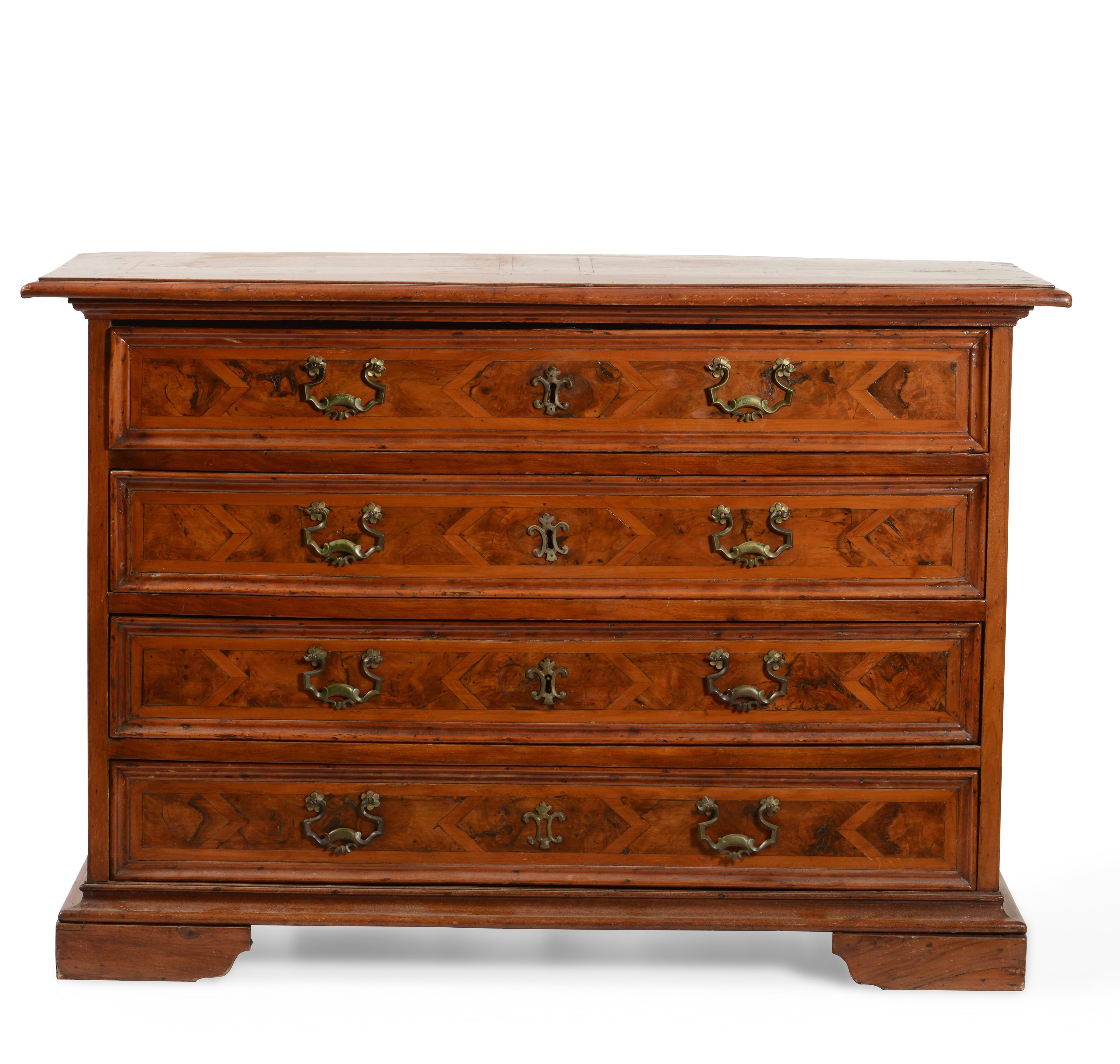 Cantarano a quattro cassetti lastronato ed intarsiato. XVIII secolo