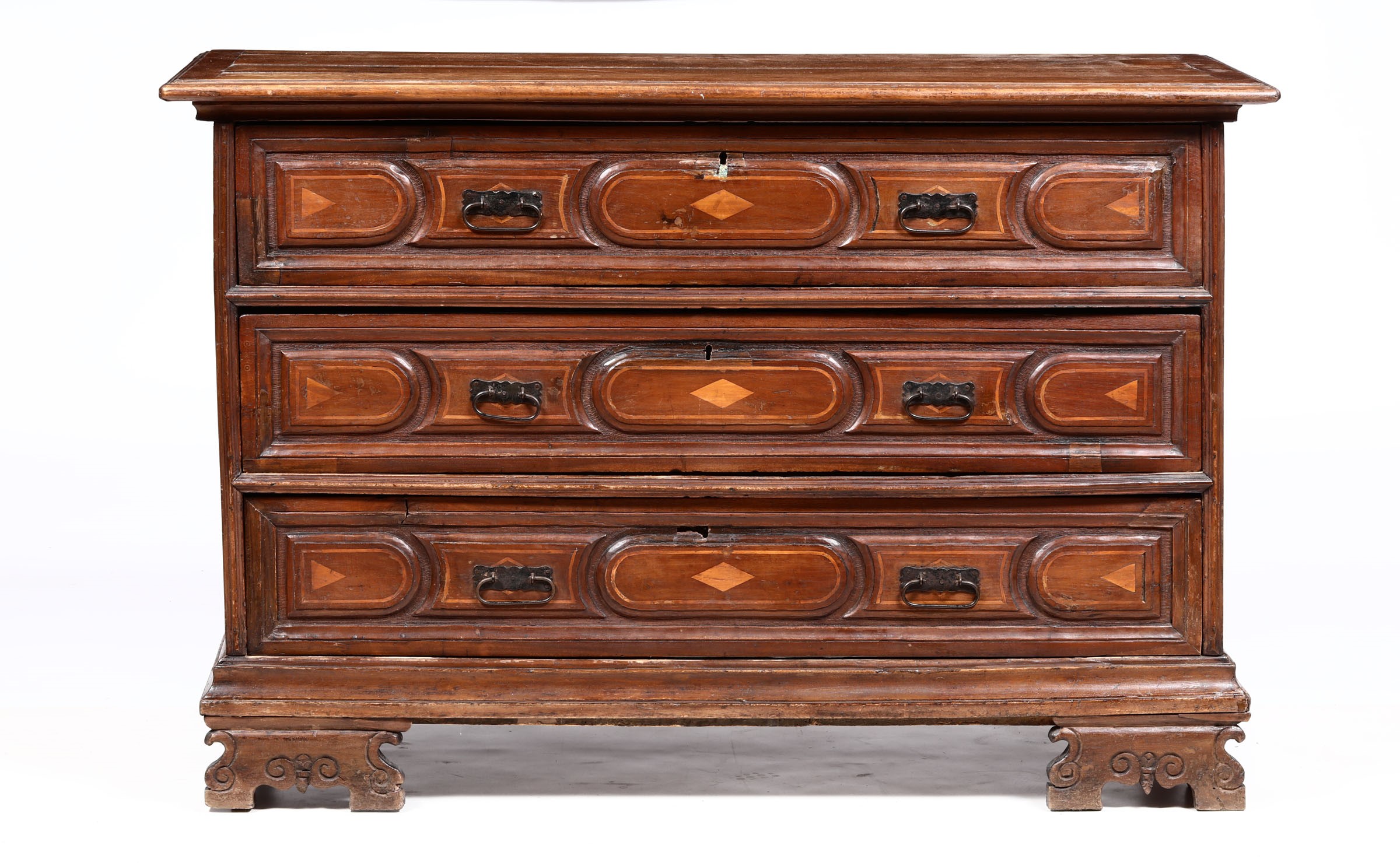 Cassettone a tre cassetti in legno massello, elementi antichi