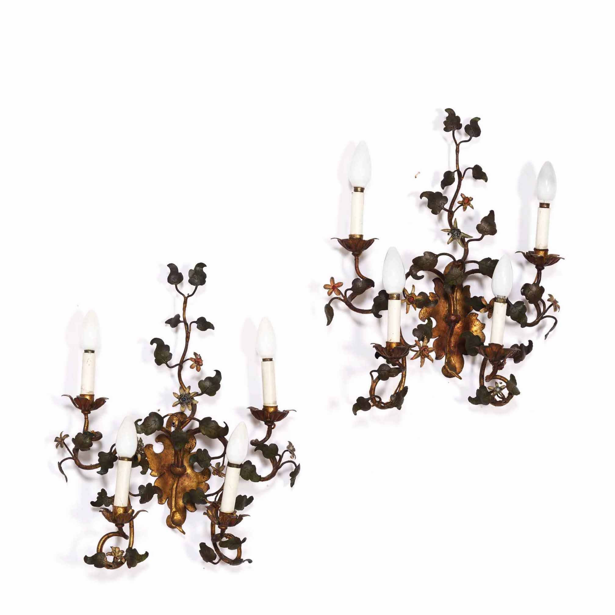 Coppia di appliques a quattro luci in ferro decorate a motivi fogliati