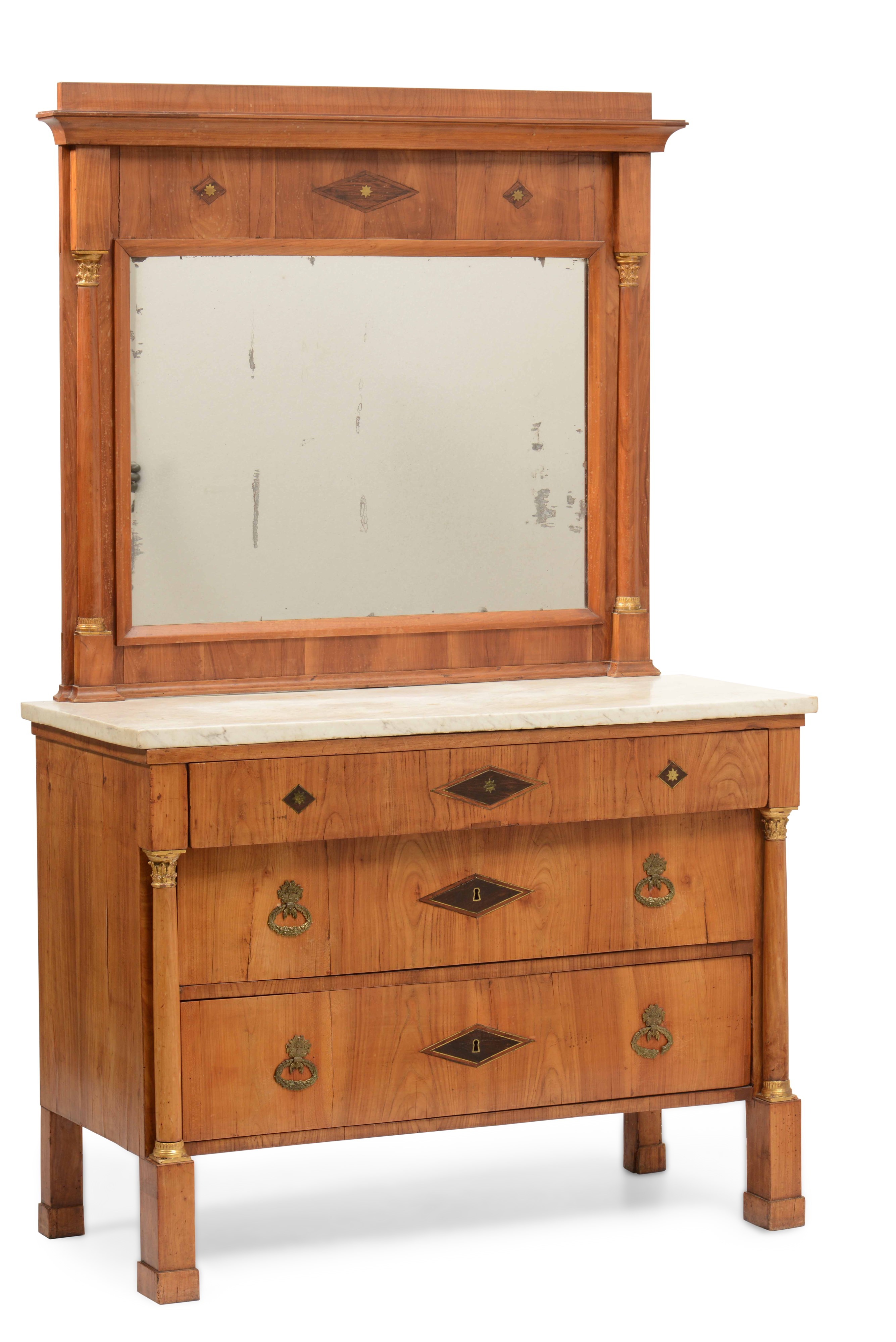 Coppia di cassettoni con specchiere in legno lastronato. XIX secolo