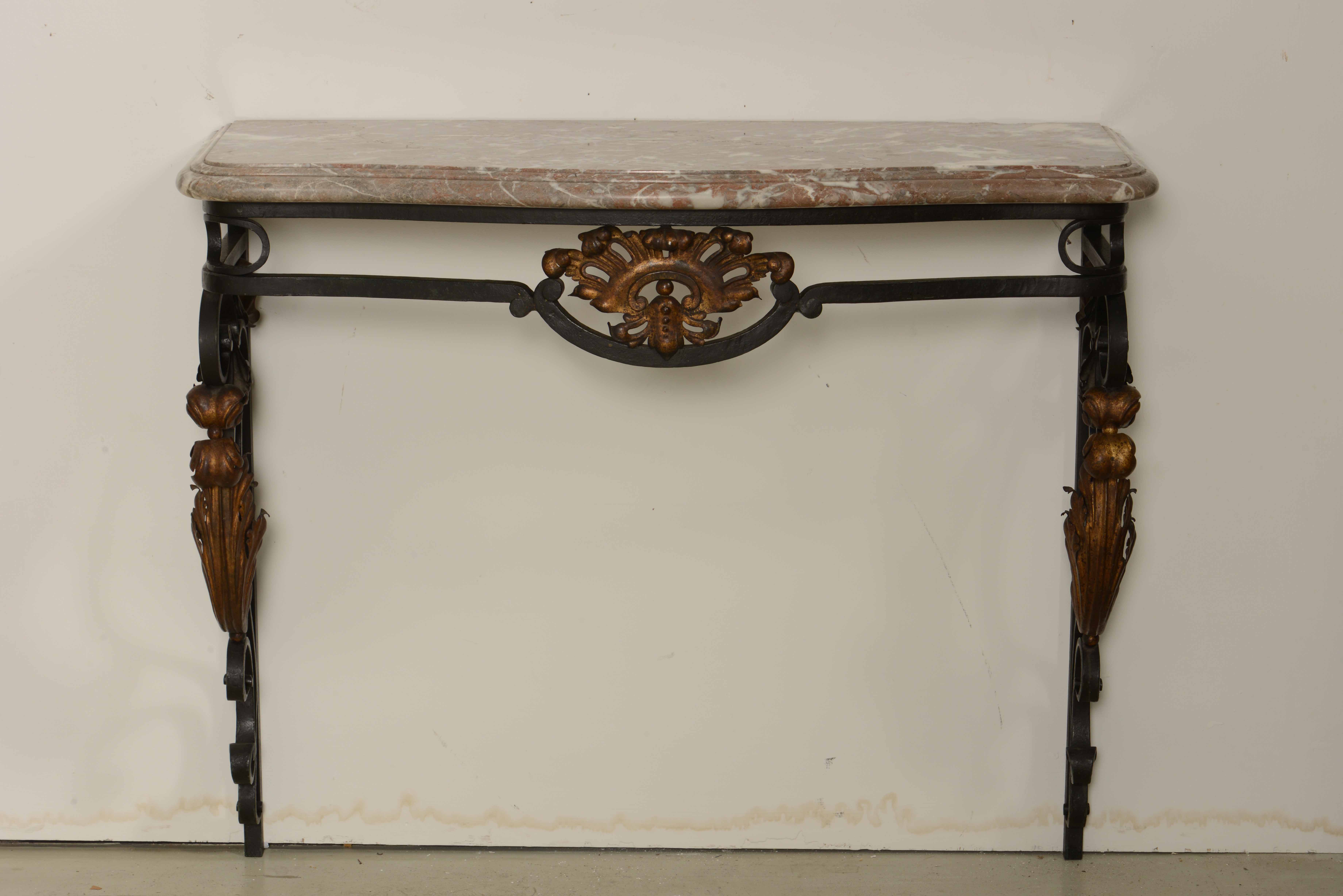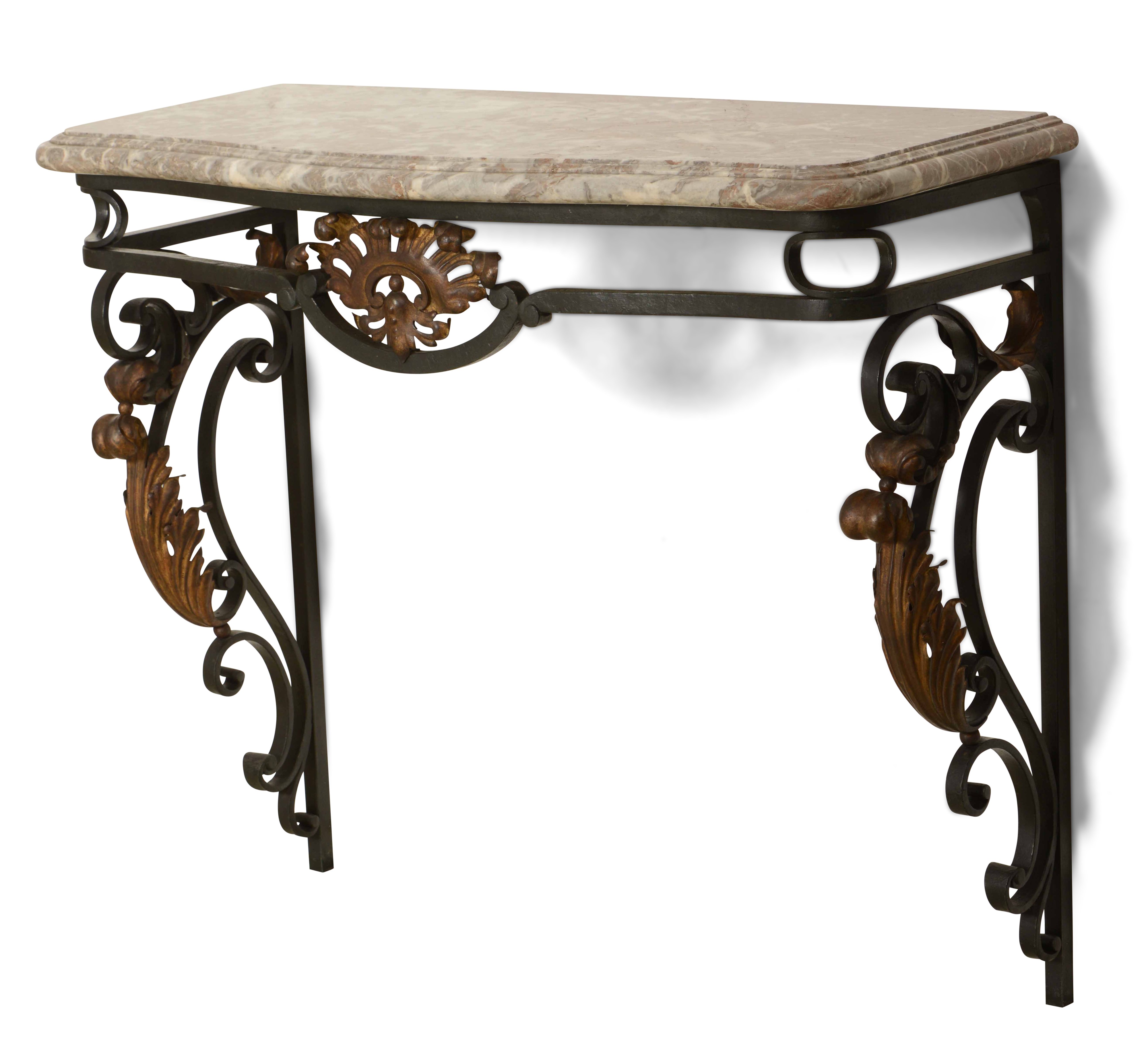 Coppia di consoles in ferro e metallo dorato, piano in marmo. Francia, Napoleone [..]
