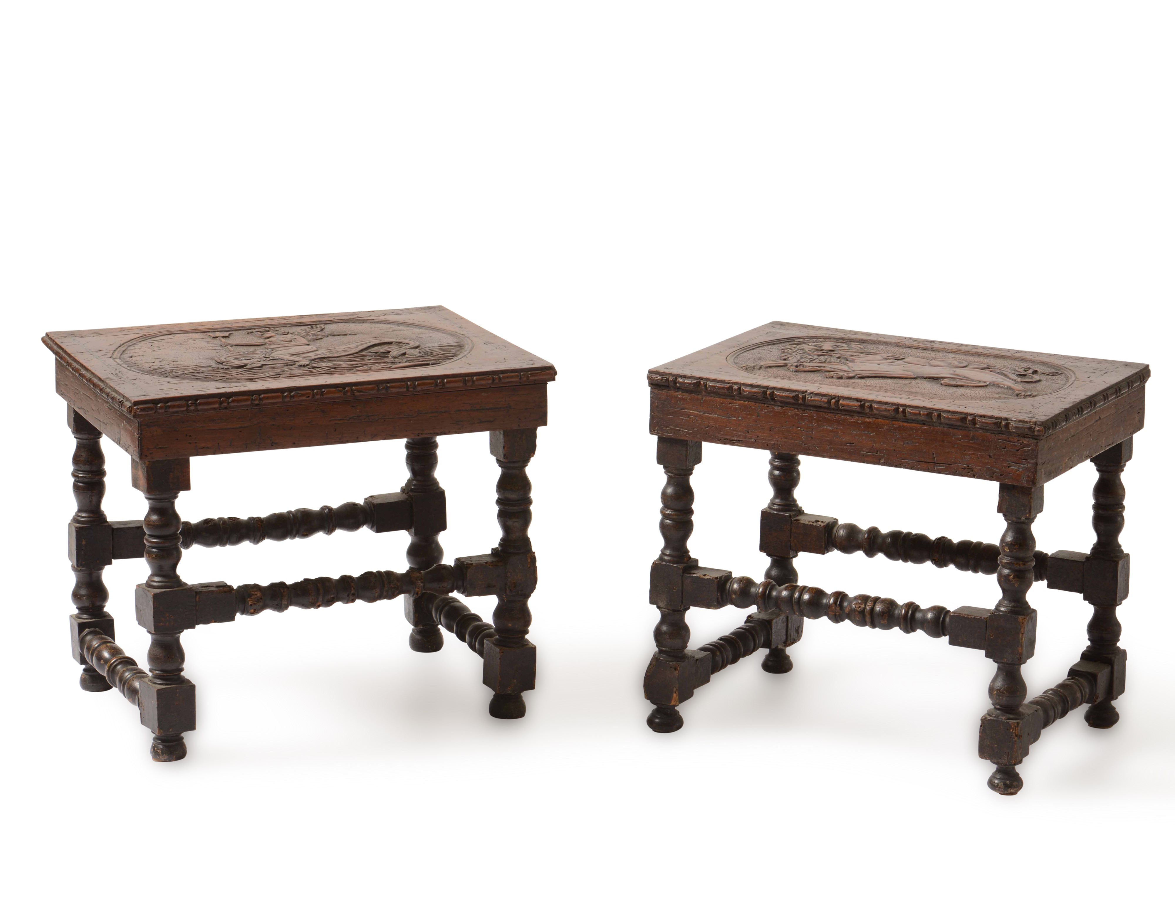 Coppia di tavolini bassi, ricomposti con elementi antichi intagliati. Italia centrale, [..]