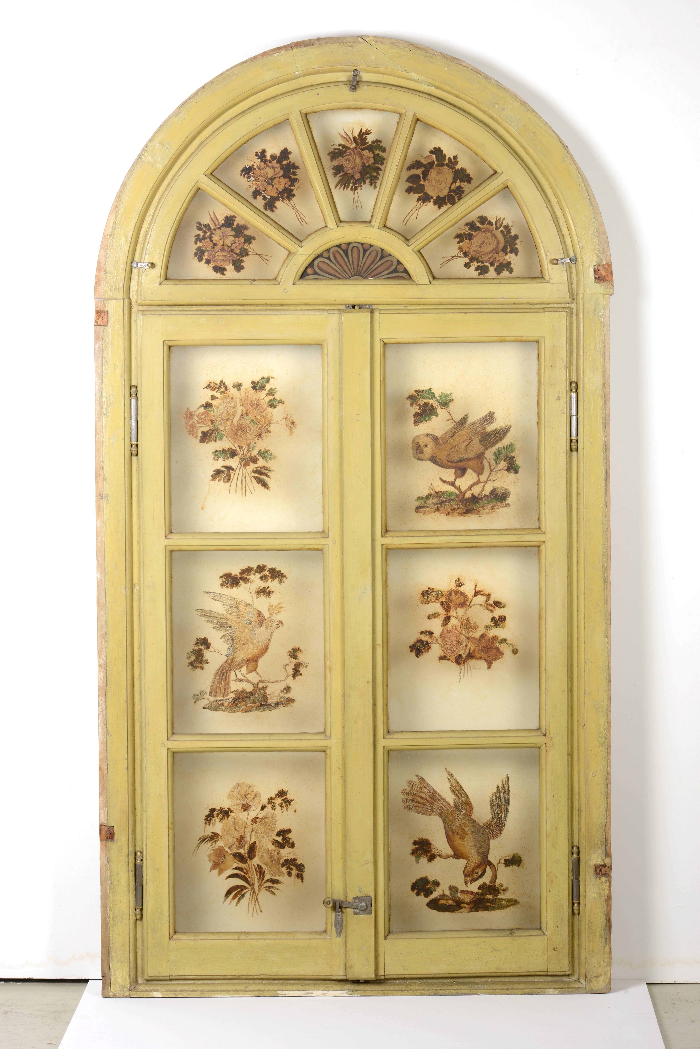 Coppia di vetrate con struttura in legno laccato e vetri dipinti a motivi floreali [..]