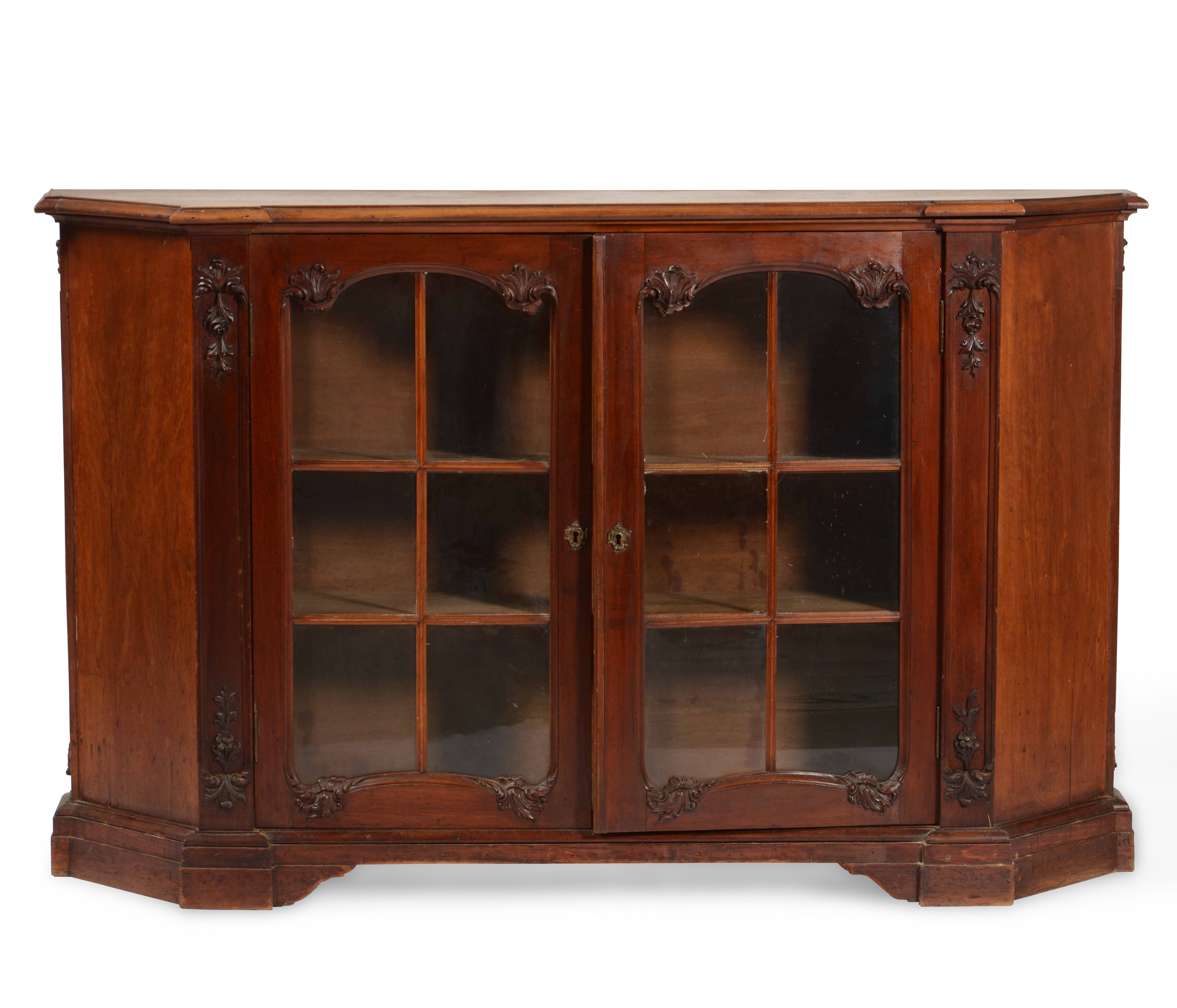 Credenza scantonata in legno intagliato con ante a vetro, XX secolo