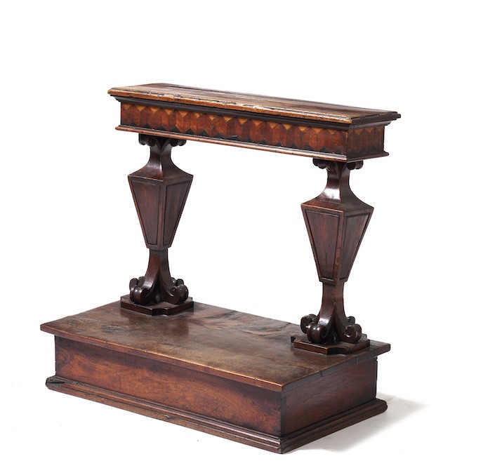 Inginocchiatoio in legno intagliato e legno intarsiato. XVIII secolo