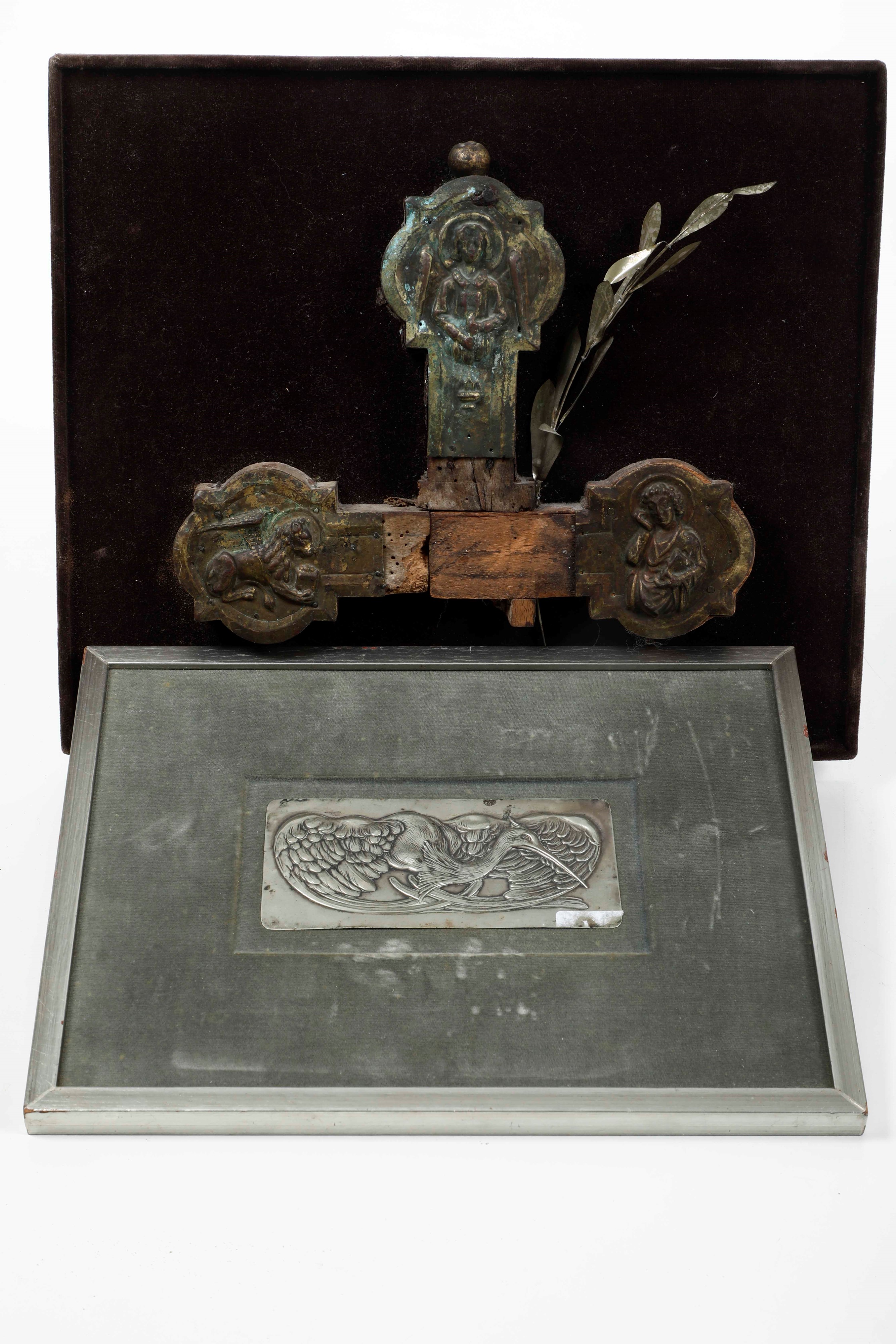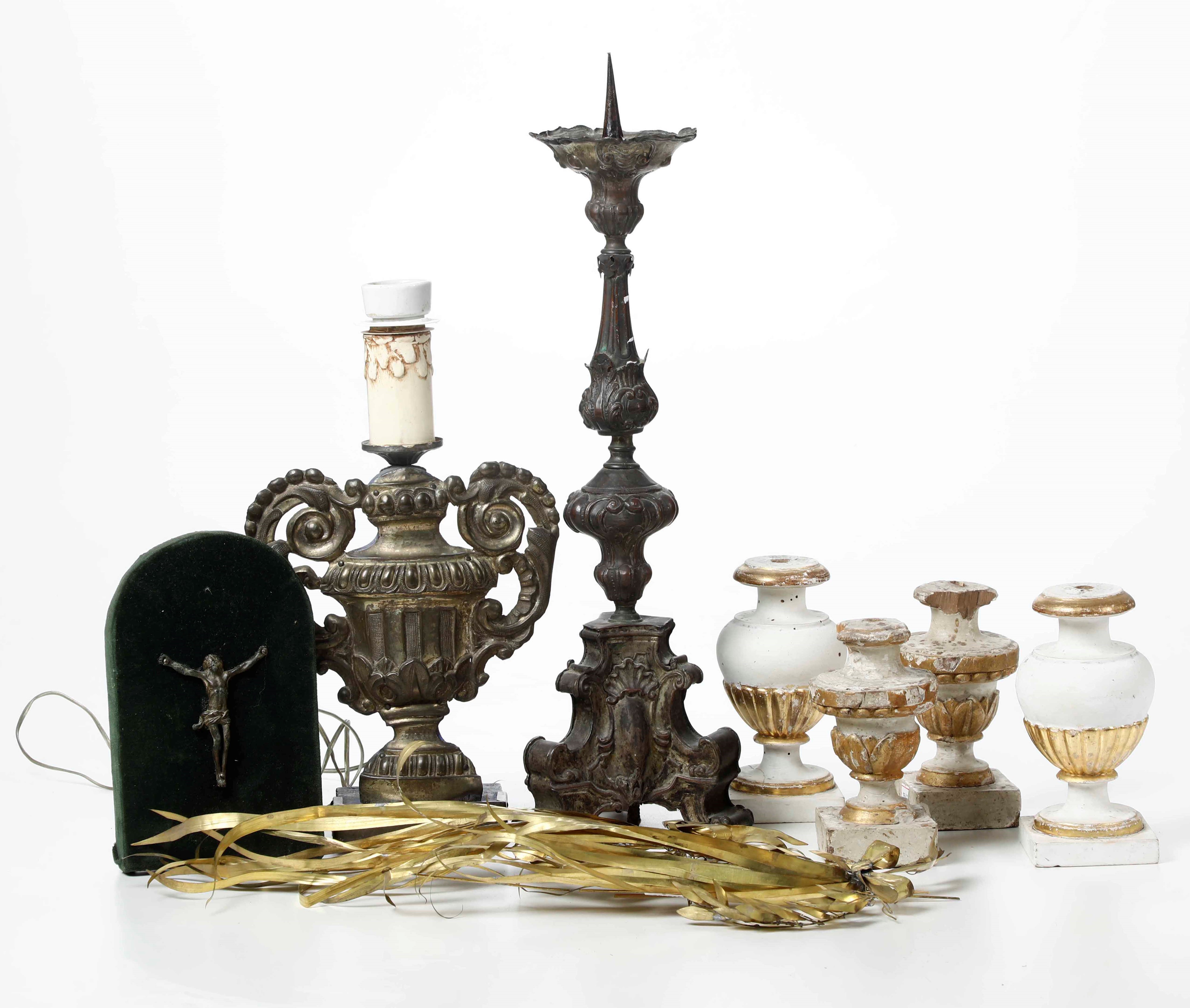 Lotto di oggetti sacri in metallo e portapalme in legno laccato