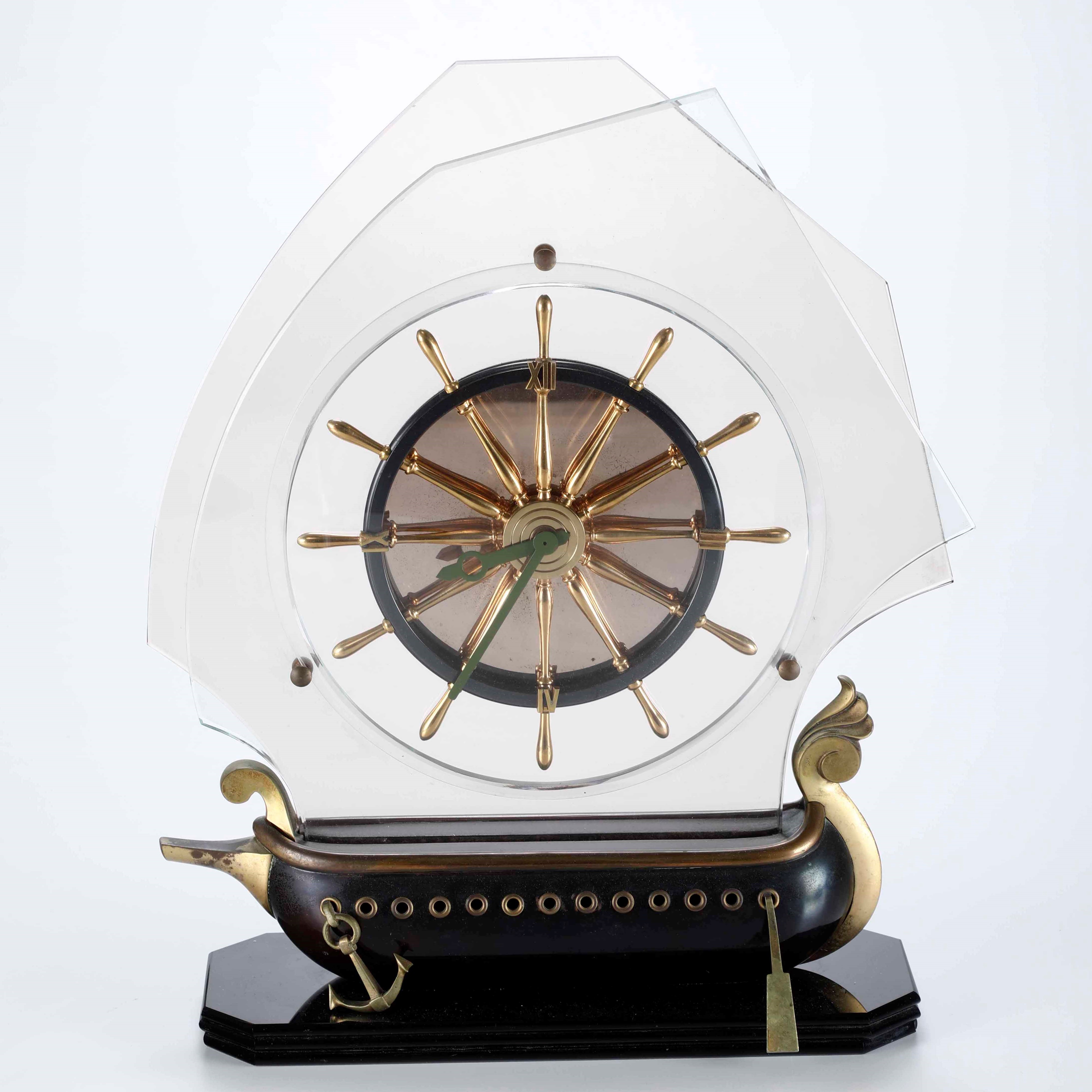 Orologio con quadrante a foggia di timone e base a forma di nave
