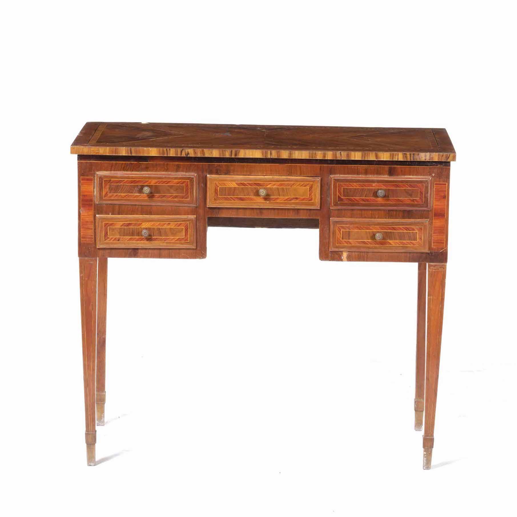 Piccola scrivania a cinque cassetti in legno lastronato e filettato. XVIII-XIX s [..]