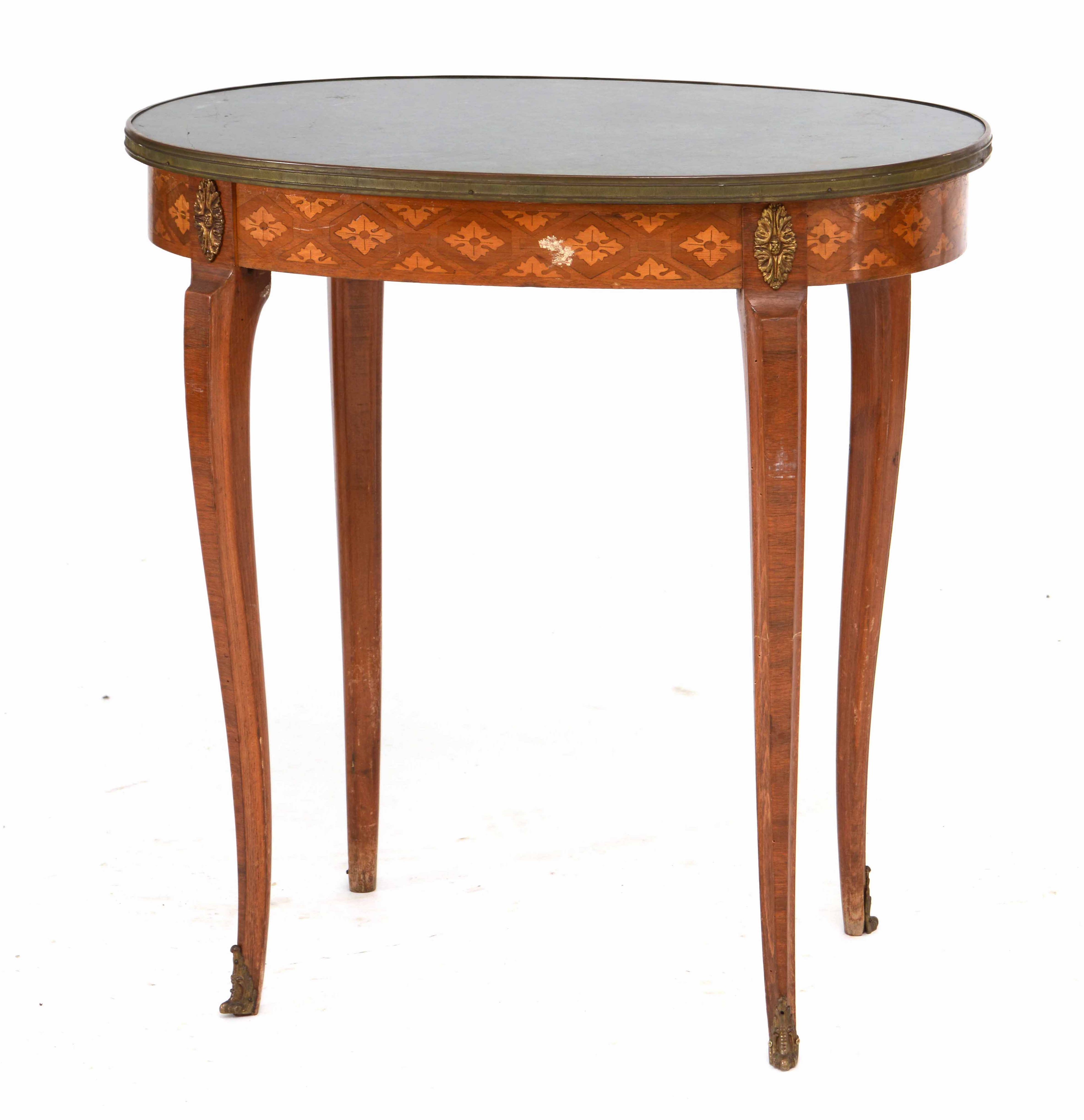 Tavolino d’appoggio in vari legni, piano in verde alpi. Francia, epoca Napoleone [..]