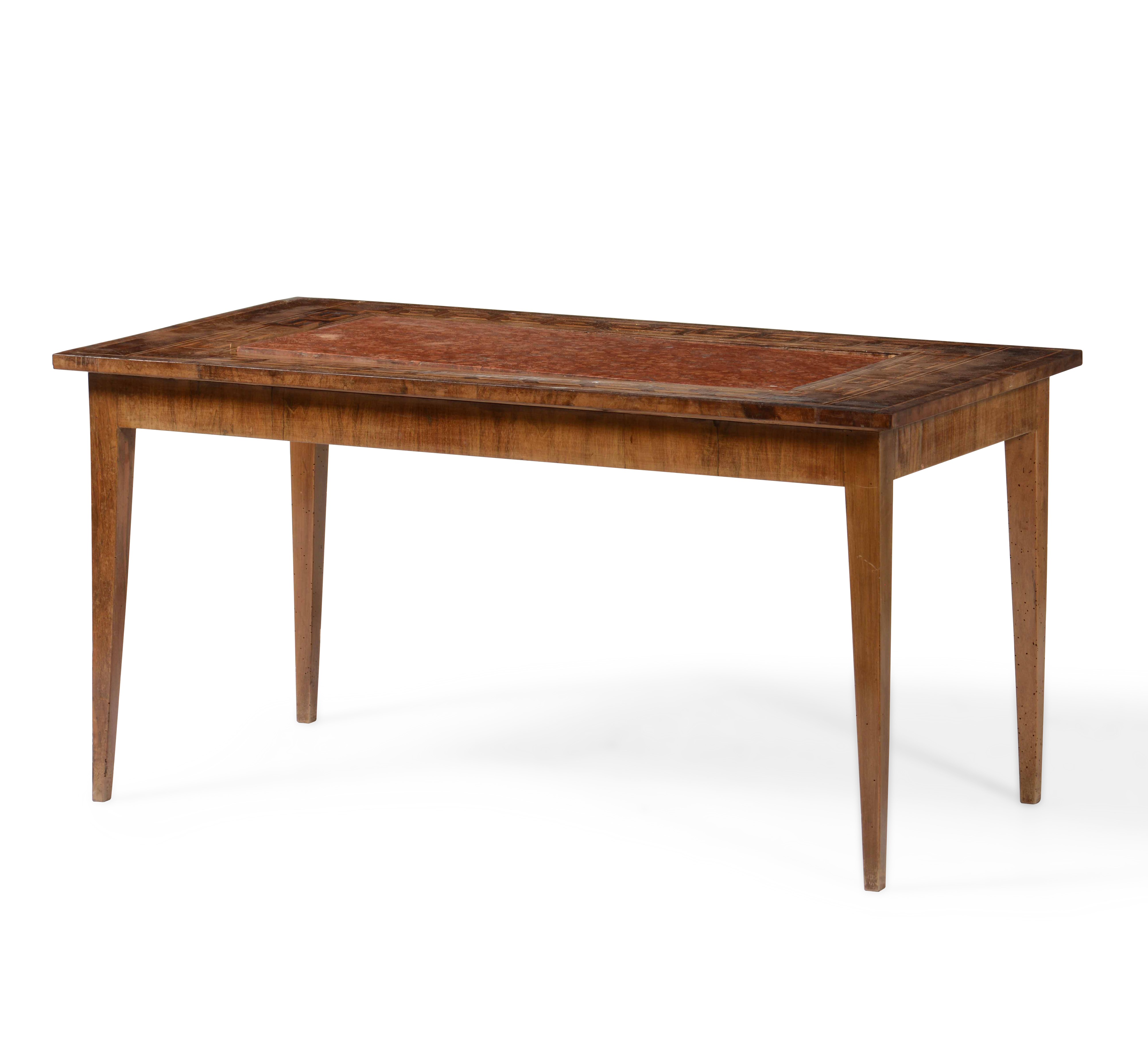 Tavolo con piano intarsiato e marmo rosso di Verona incassato, ricomposto con elementi [..]