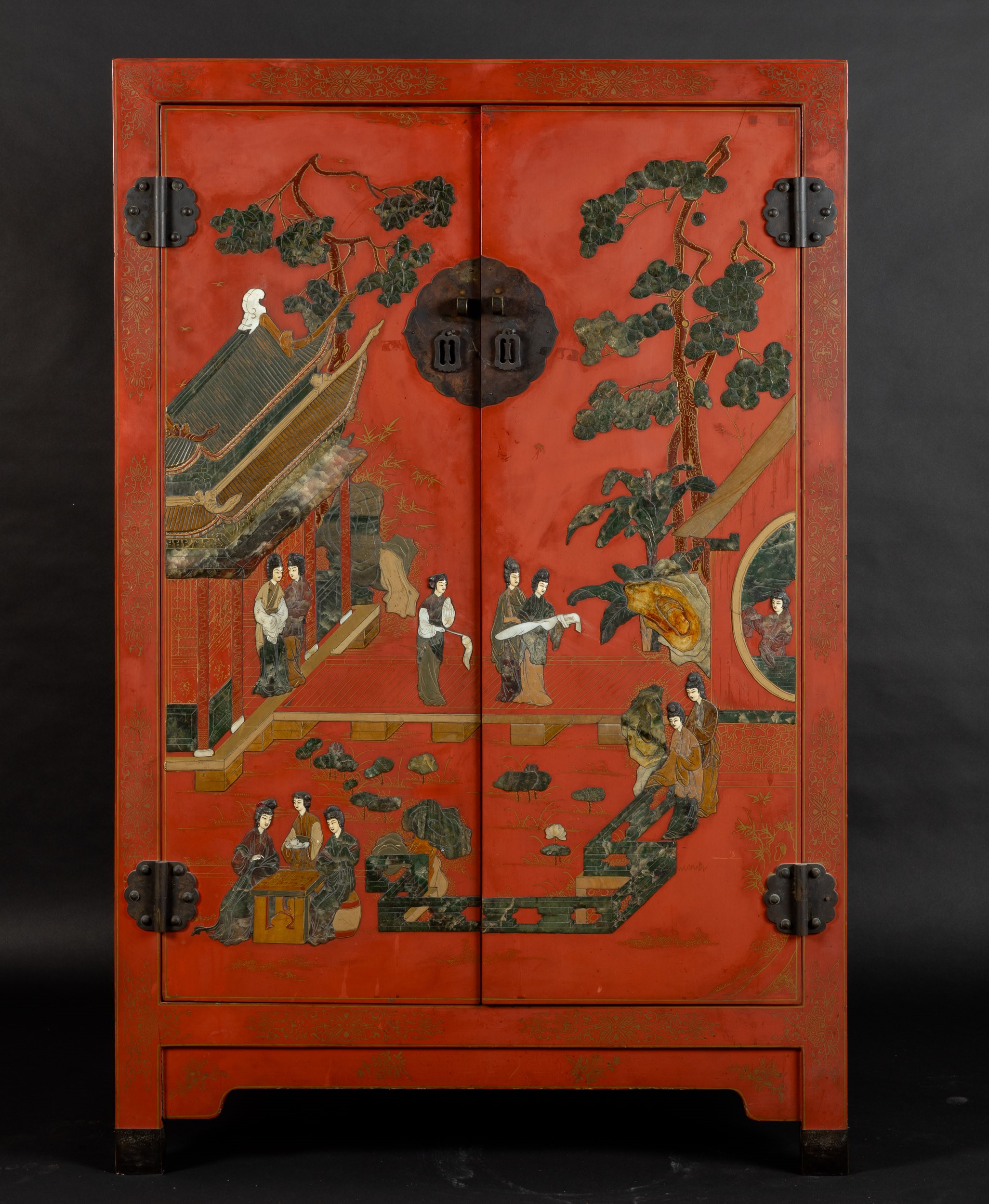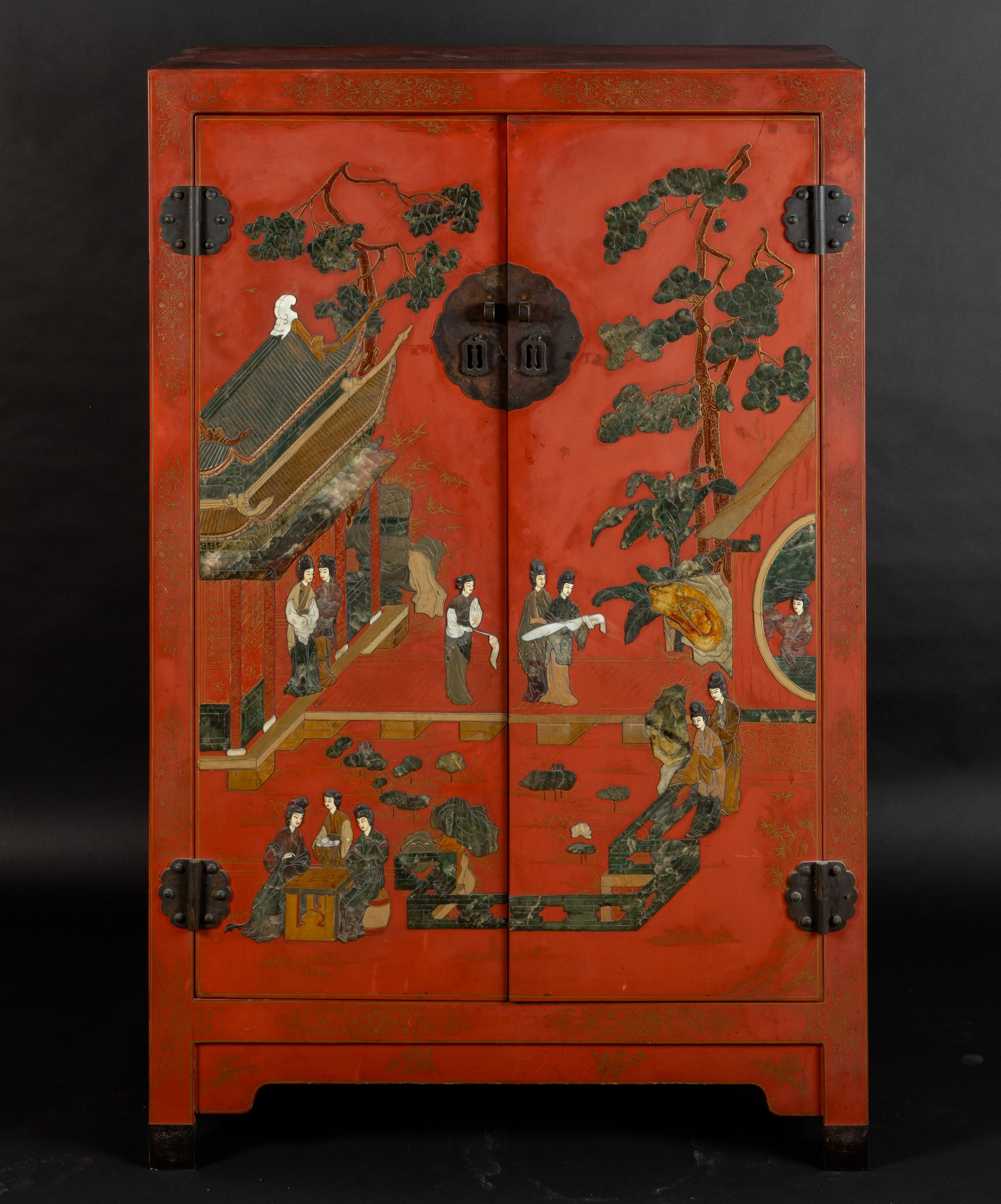 Cabinet a due ante in legno laccato con applicazioni in pietre dure e scene di vita [..]