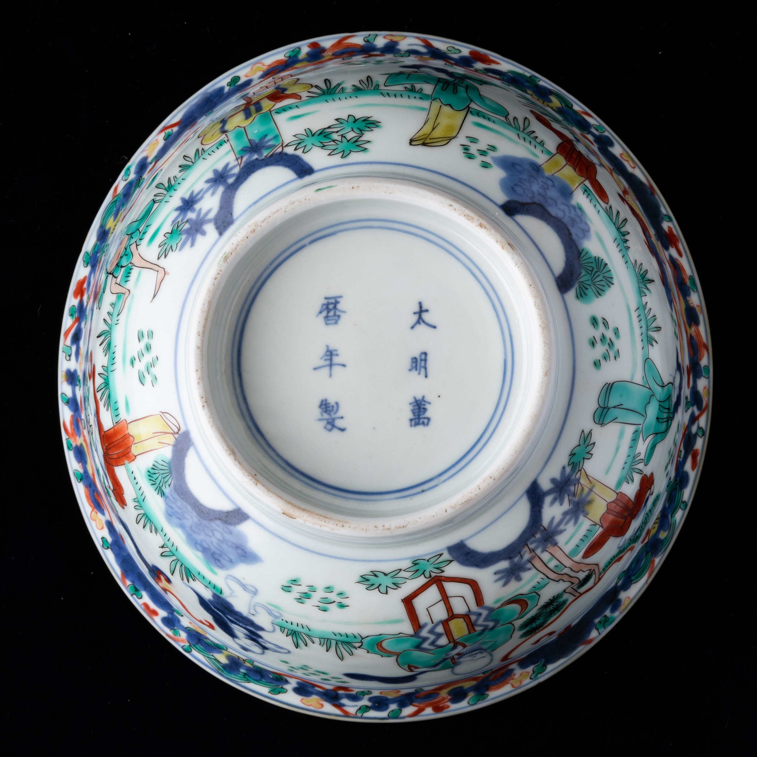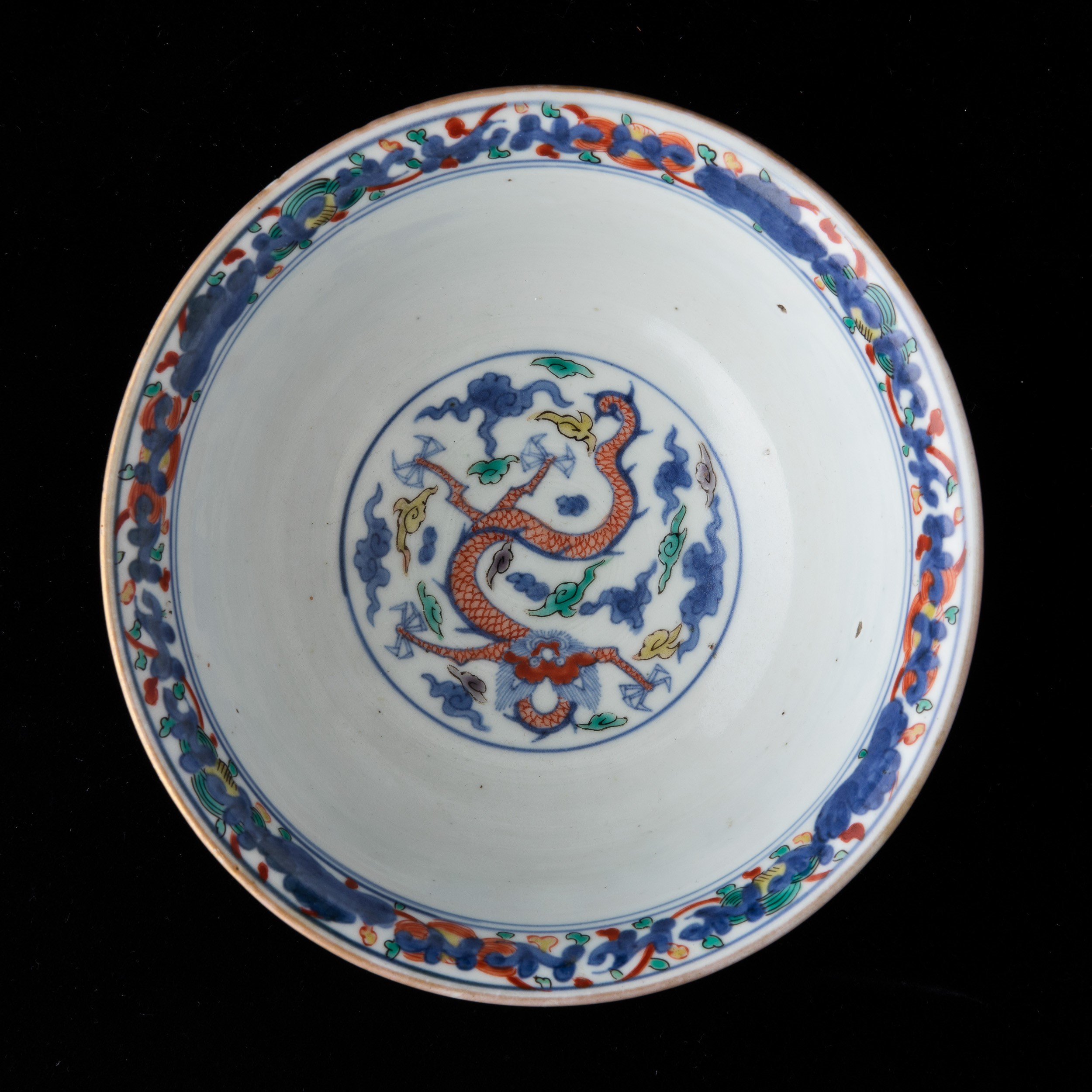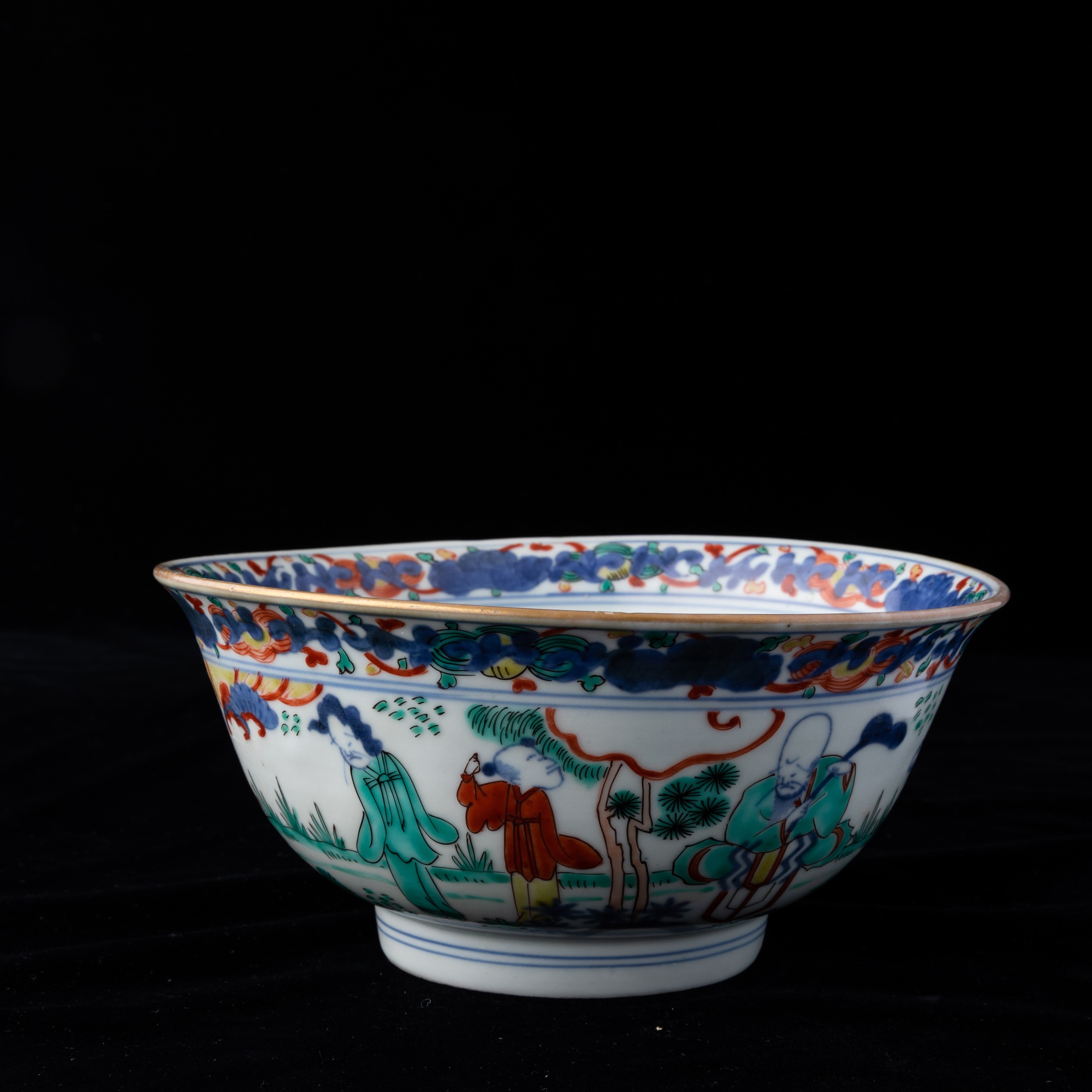 Ciotola in porcellana a smalti Woucai con figure di saggi e drago, Cina, Dinastia [..]