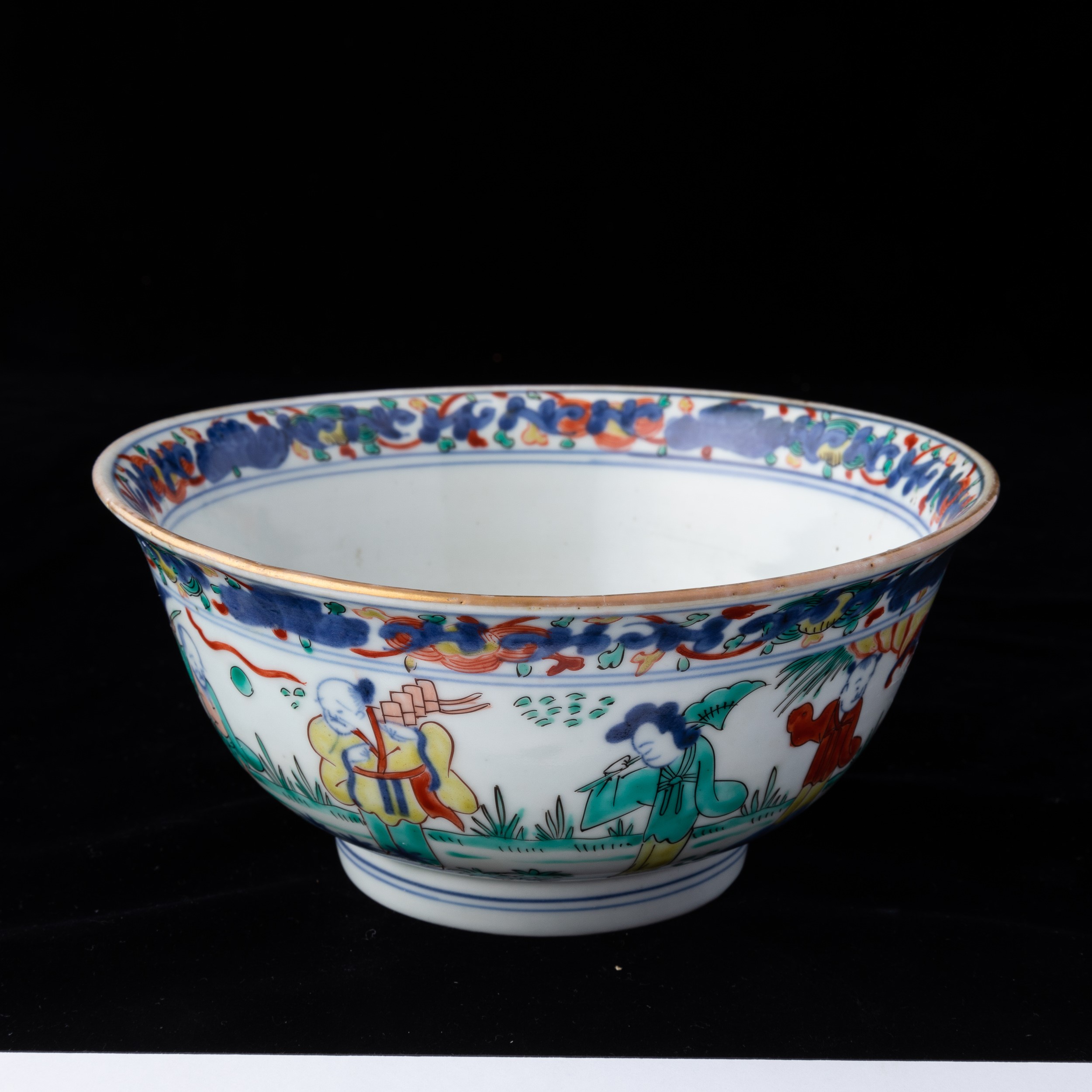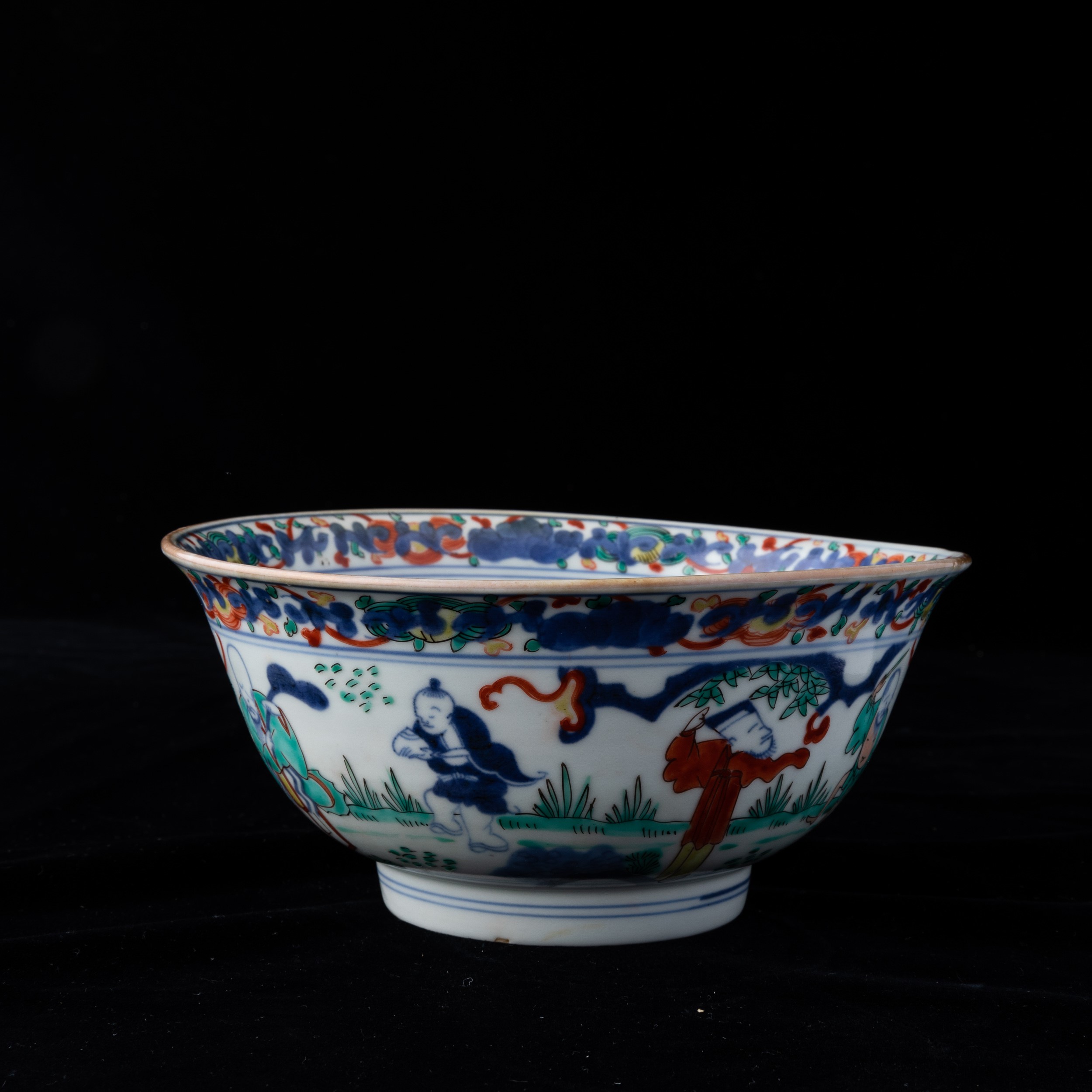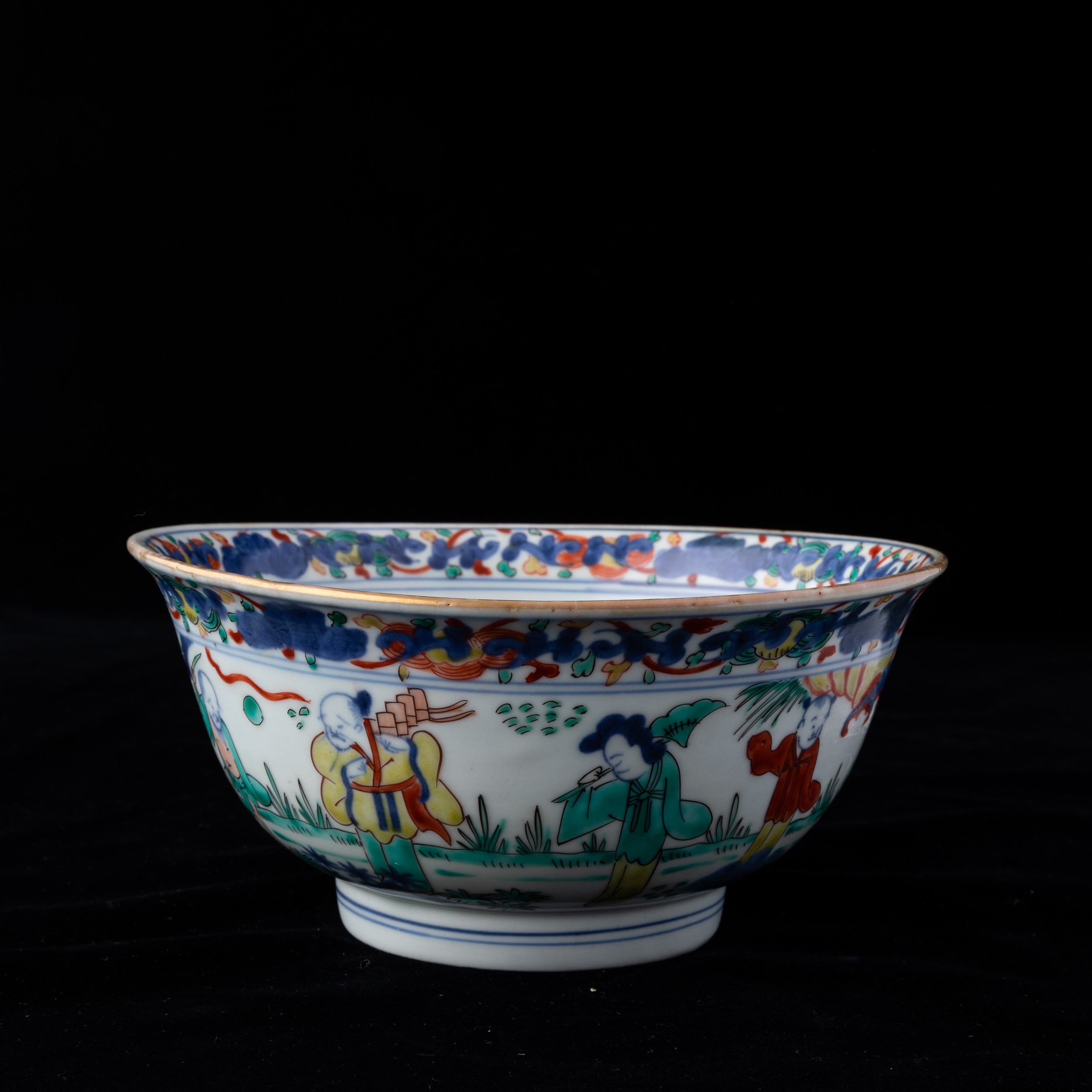 Ciotola in porcellana a smalti Woucai con figure di saggi e drago, Cina, Dinastia [..]