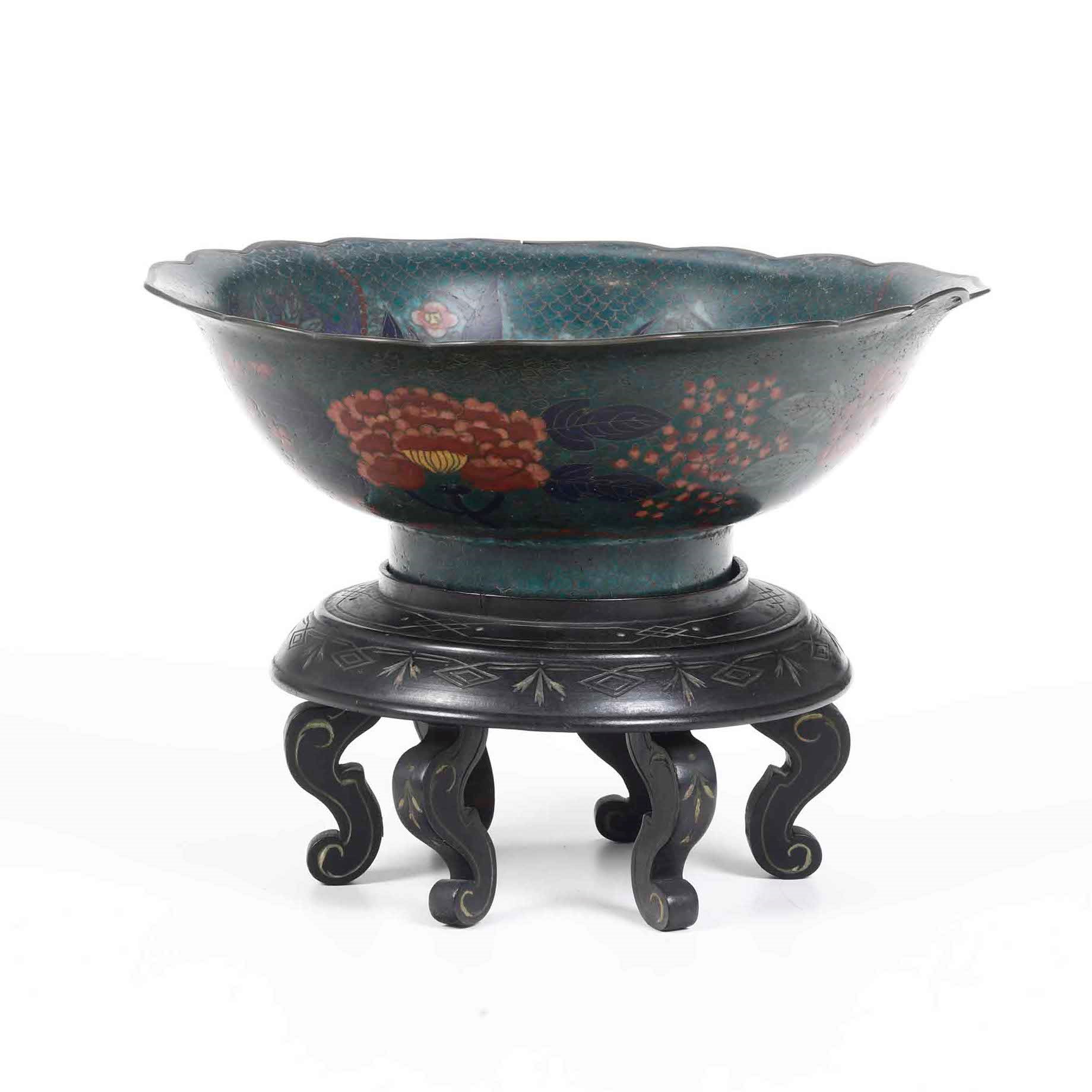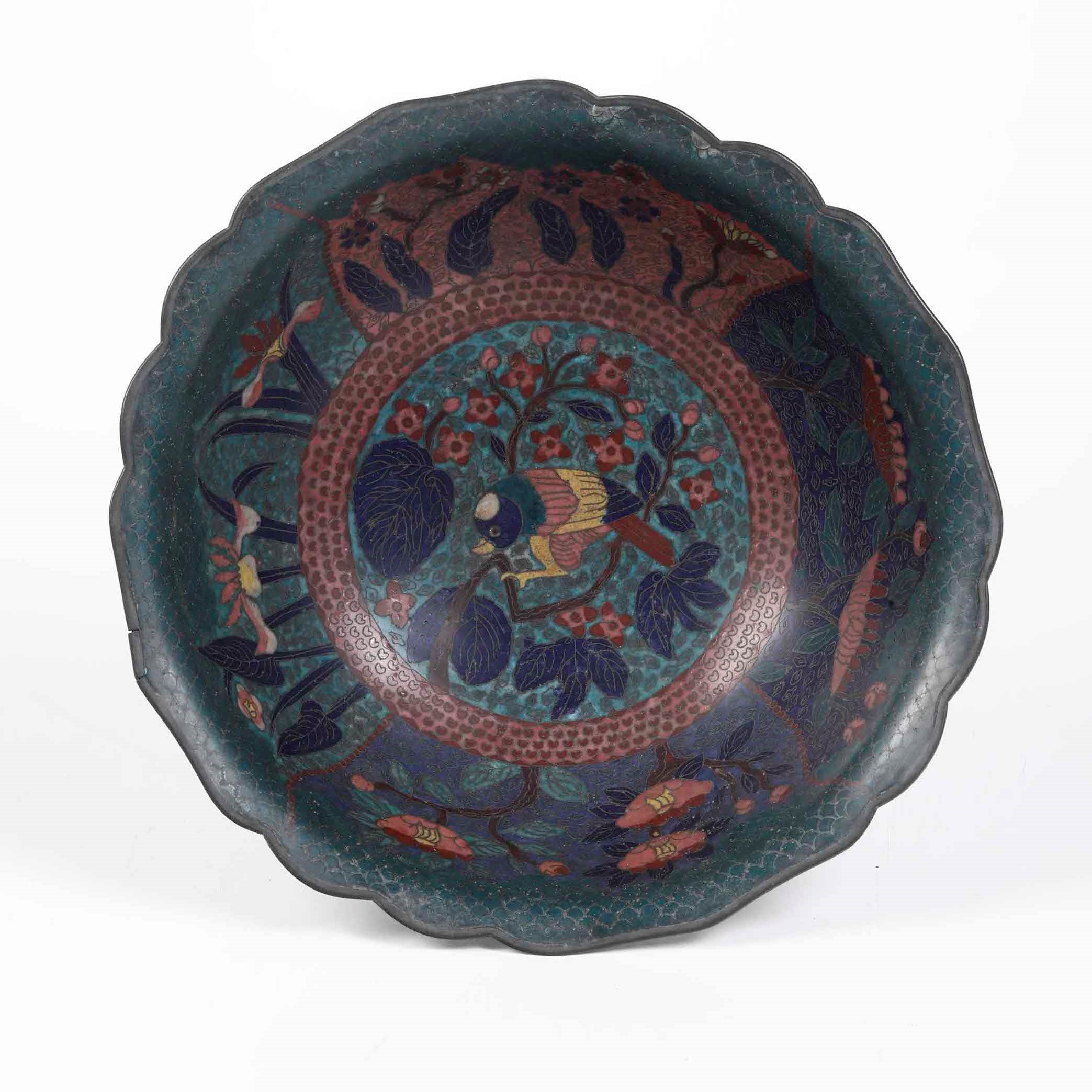 Ciotola in smalto con soggetti naturalistici entro riserve e decori floreali, Cina, [..]