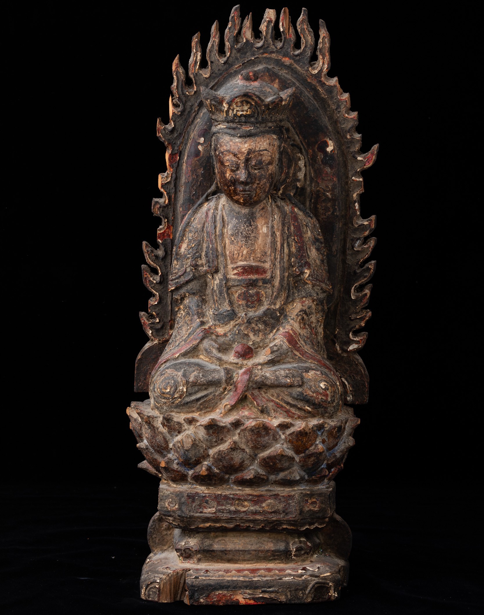 Figura di Buddha Amitayus seduto su fiore di loto entro aura scolpito in legno con [..]