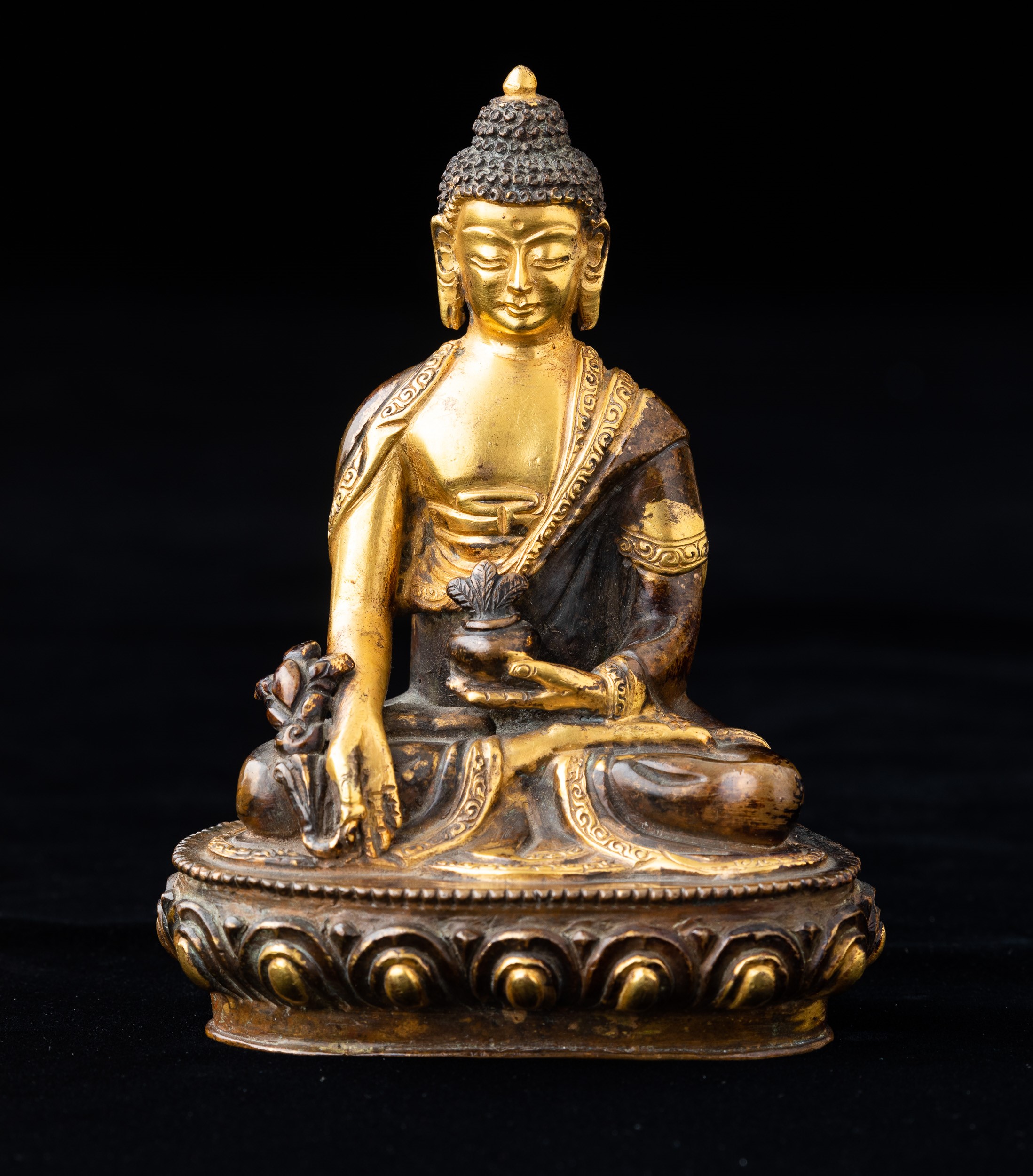 Figura di Buddha Sakyamuni seduto su doppio fiore di loto in bronzo parzialmente [..]