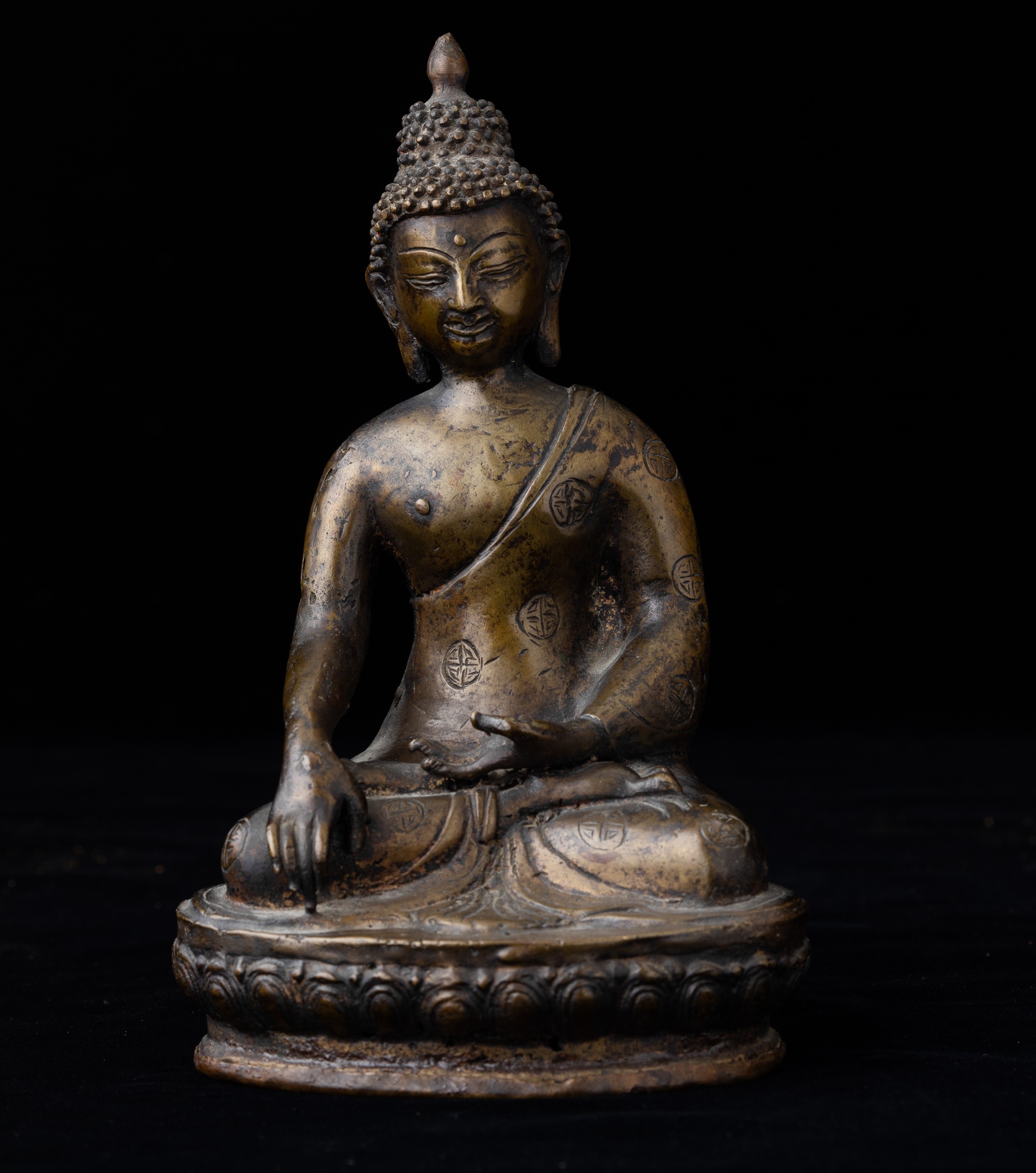 Figura di Buddha Sakyamuni seduto su fiore di loto in bronzo, Tibet, XIX secolo