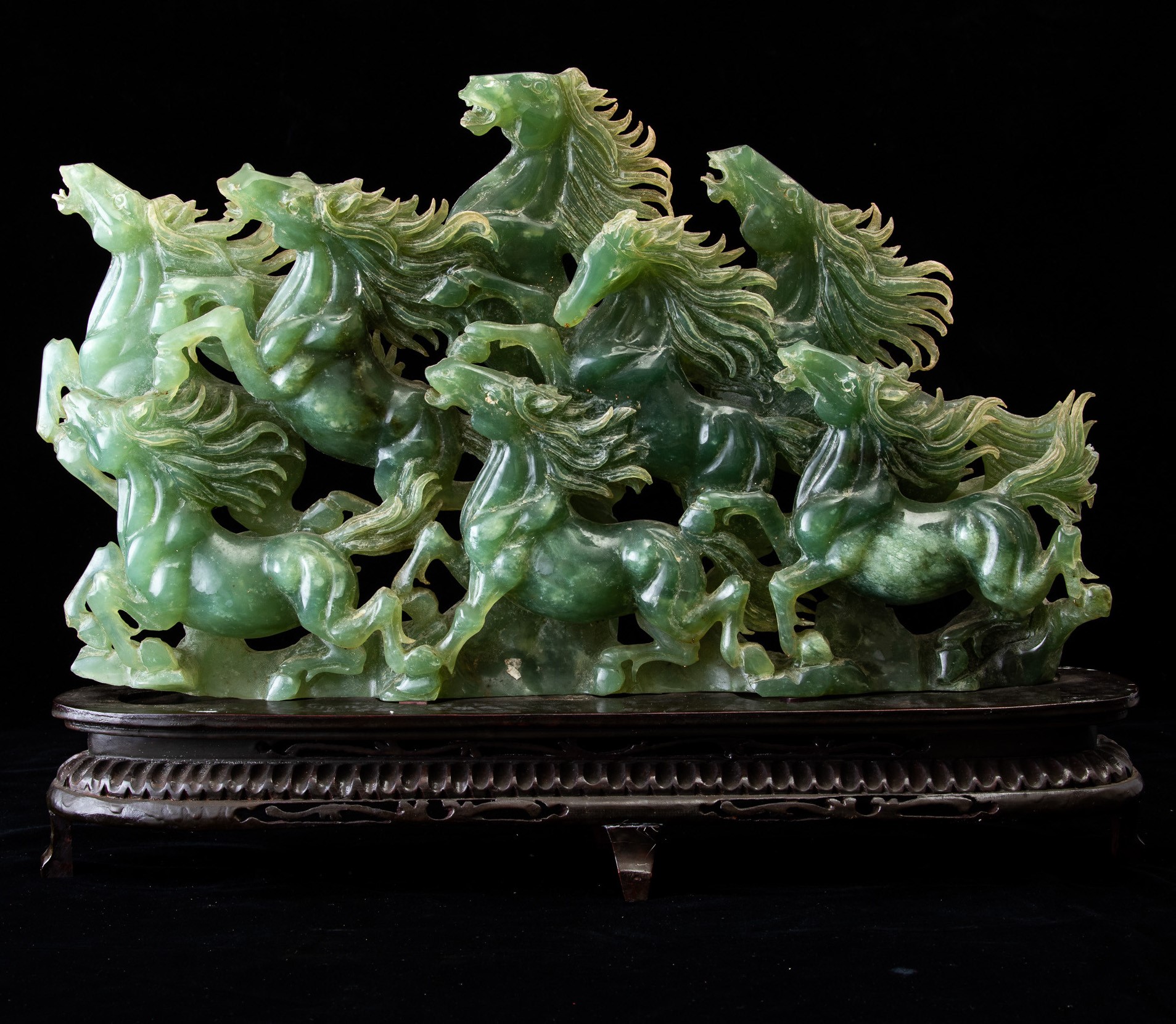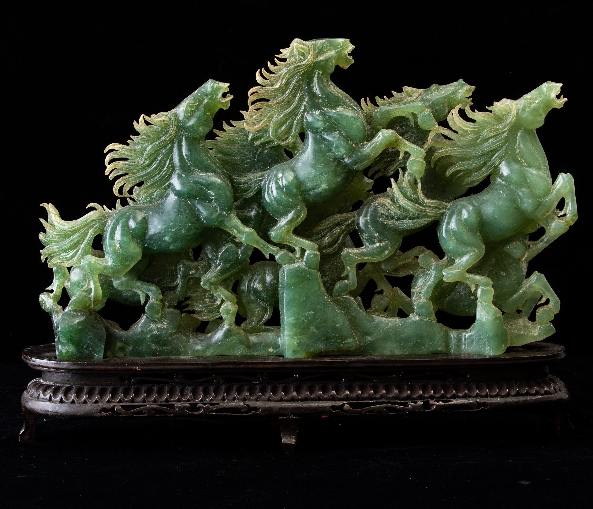 Gruppo in giadeite verde con cavalli, Cina, XX secolo