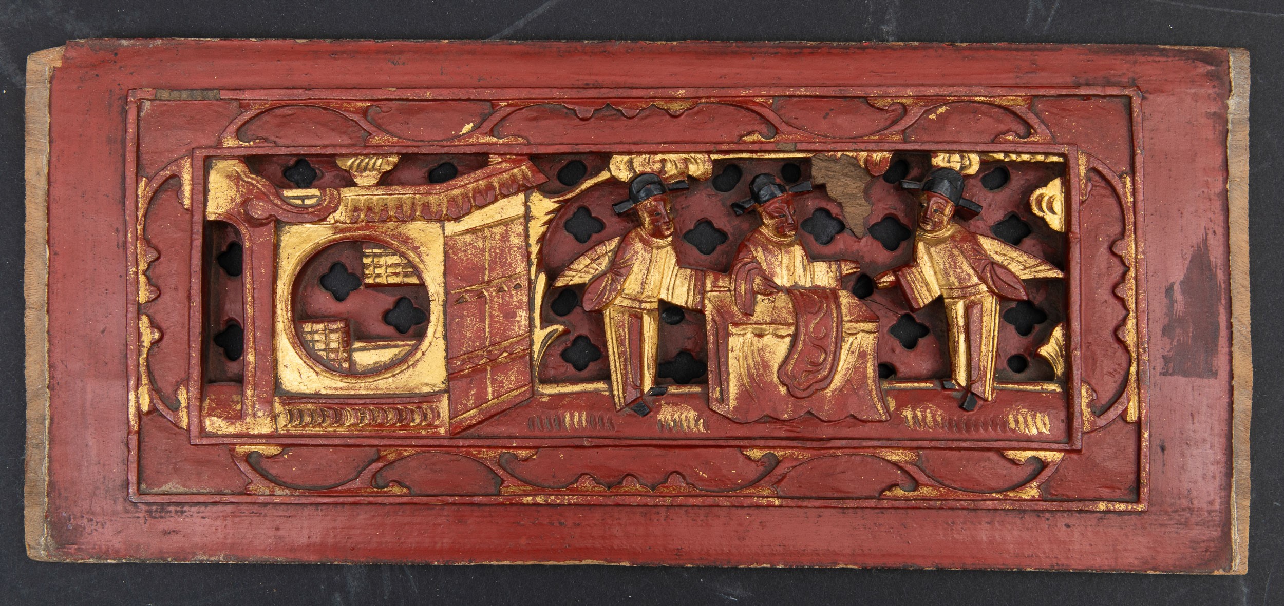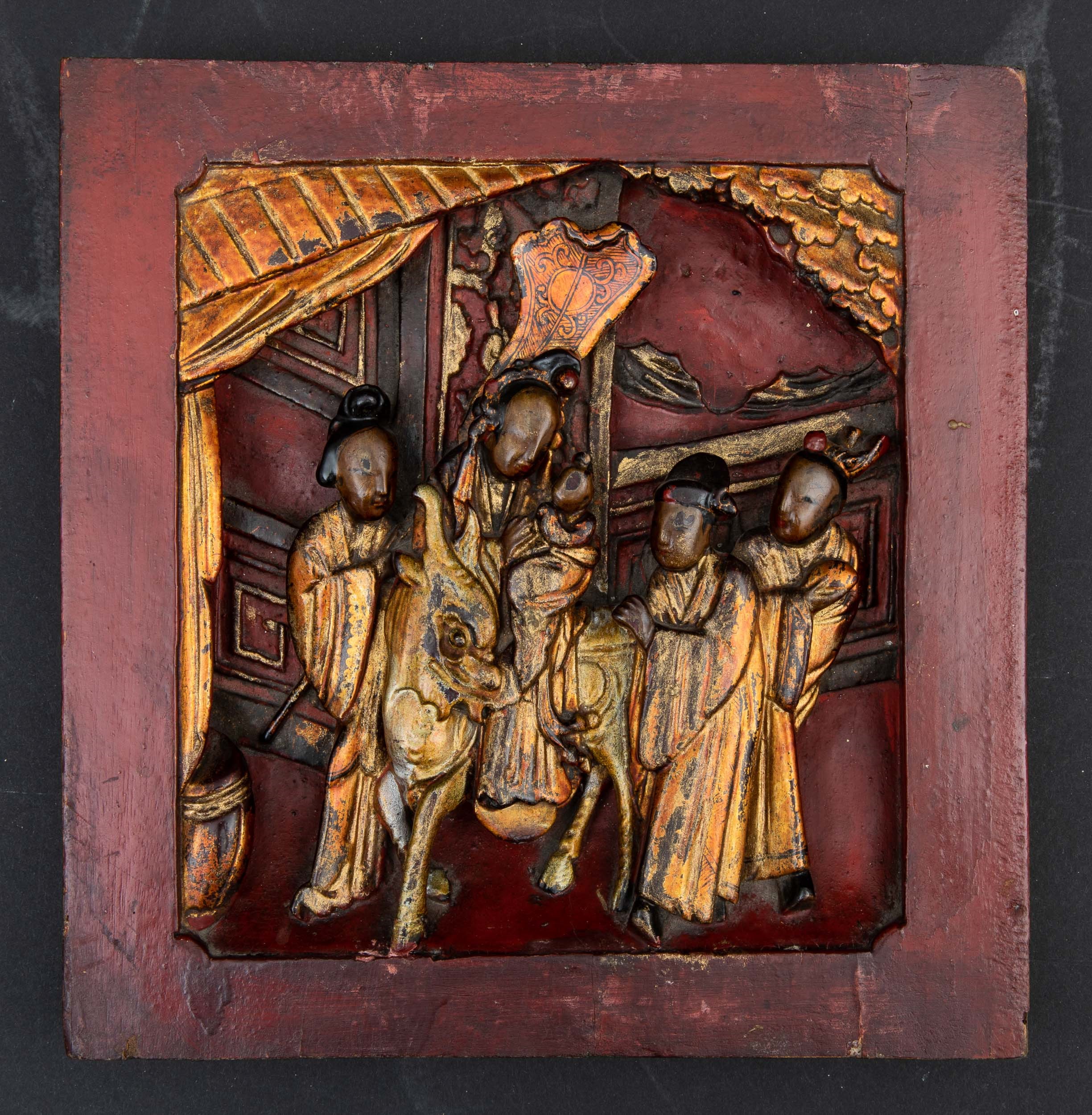 Lotto composto da cinque pannelli diversi scolpiti in legno laccato e dorato, Canton, [..]