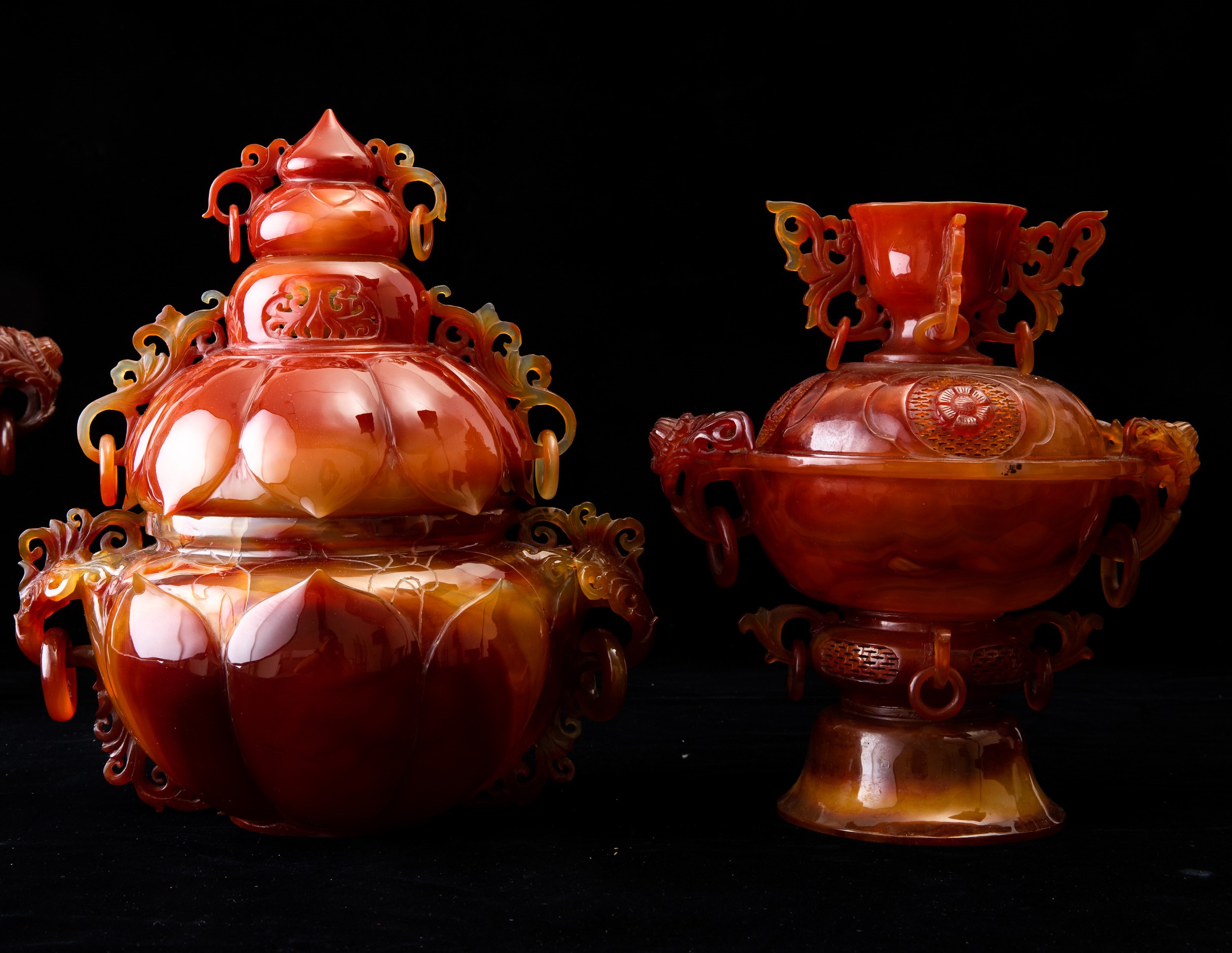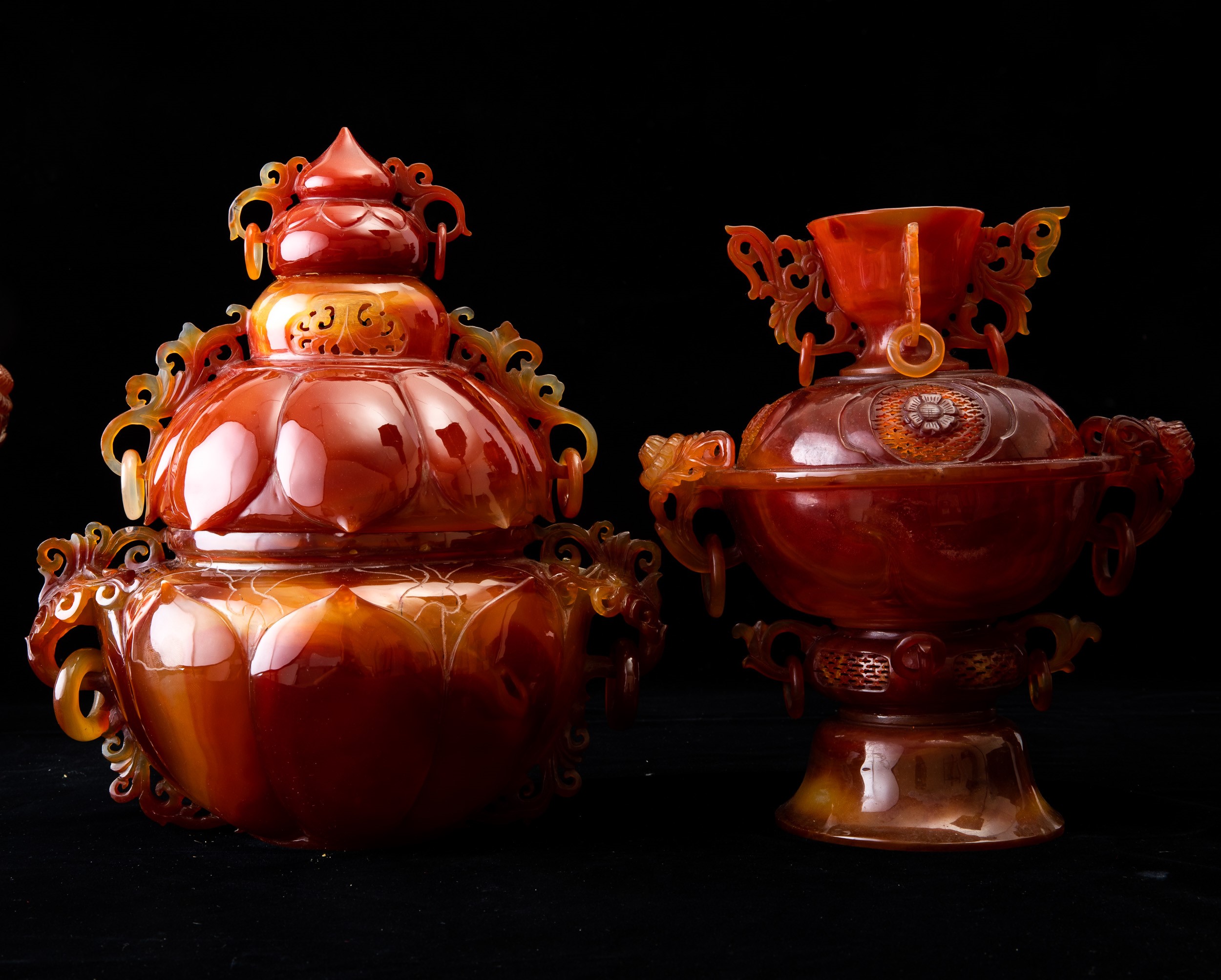 Lotto composto da sei vasi diversi con coperchio scolpiti in agata, Cina, XX sec [..]