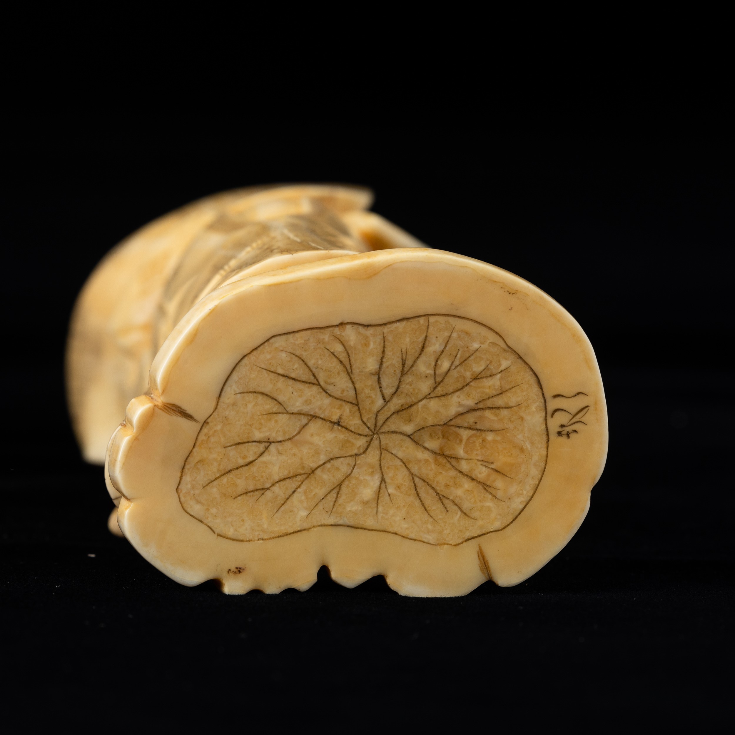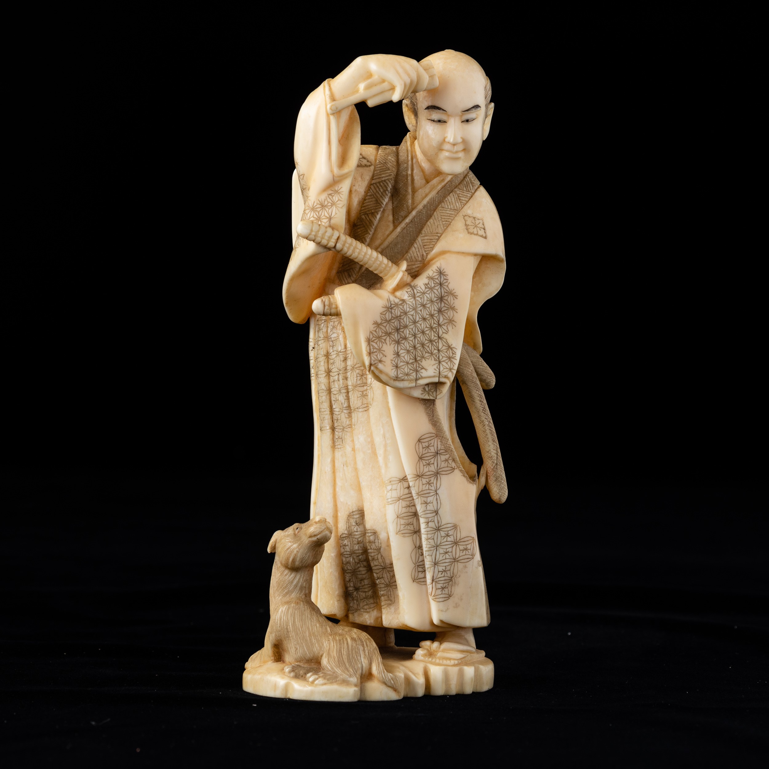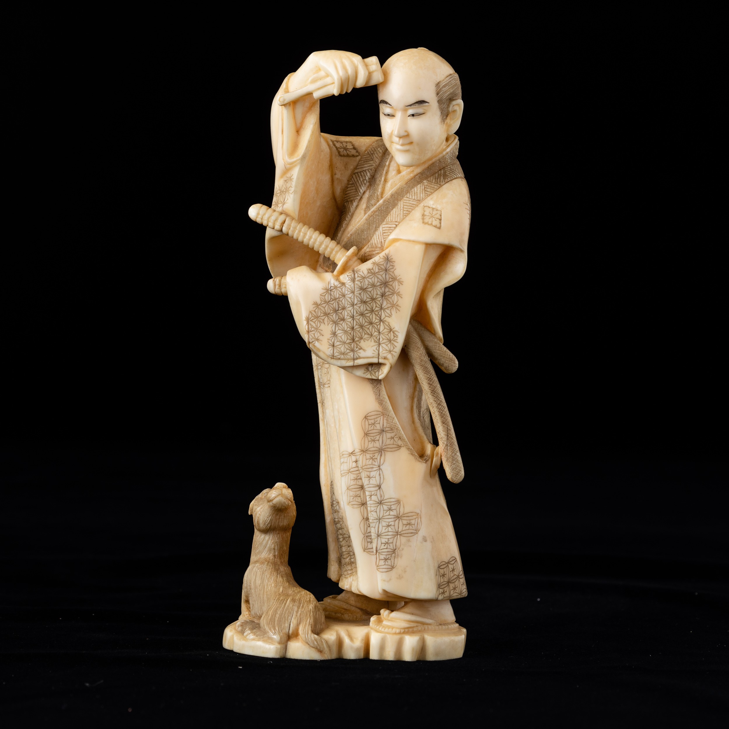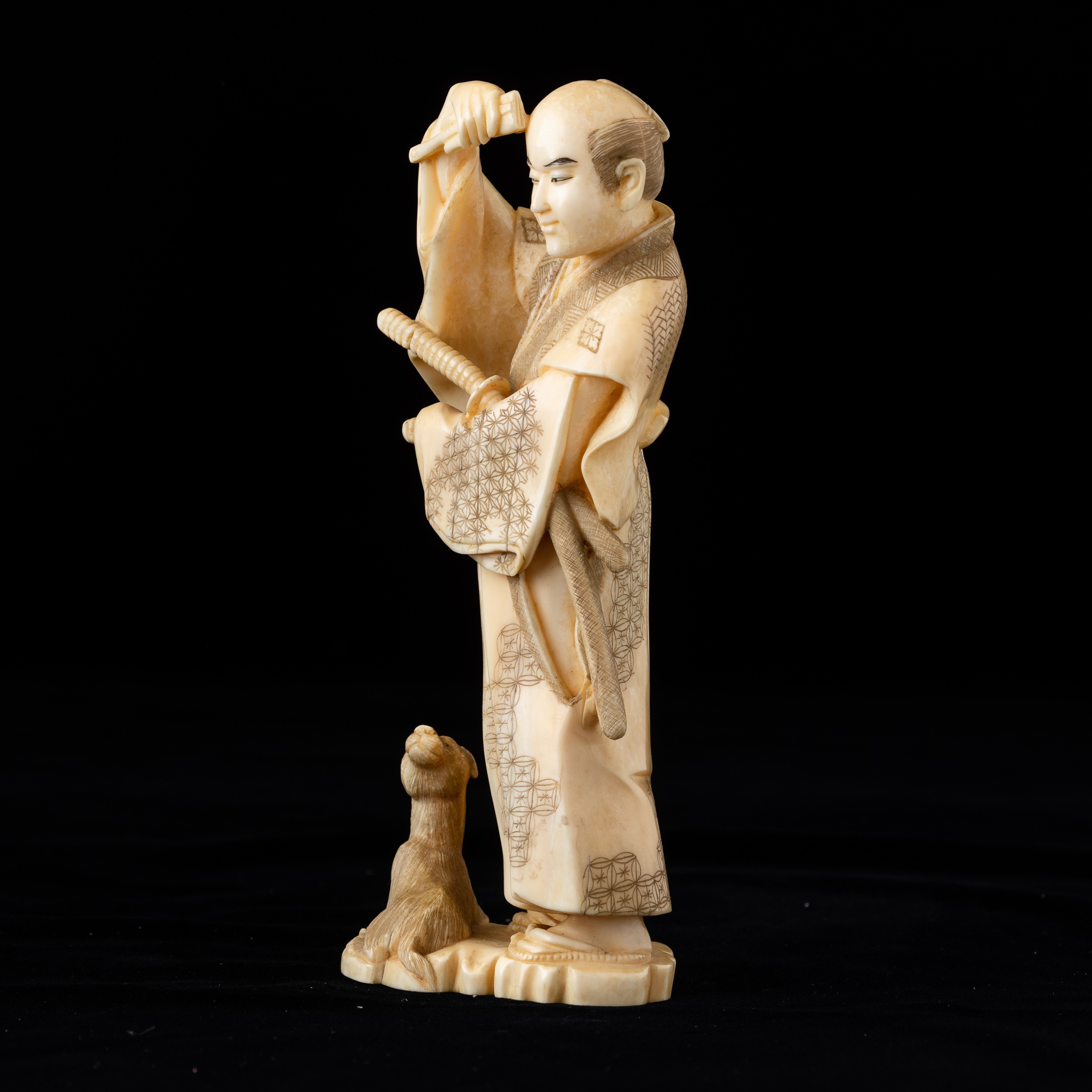 Okimono in avorio di tricheco parzialmente dipinto raffigurante Samurai, Giappone, [..]