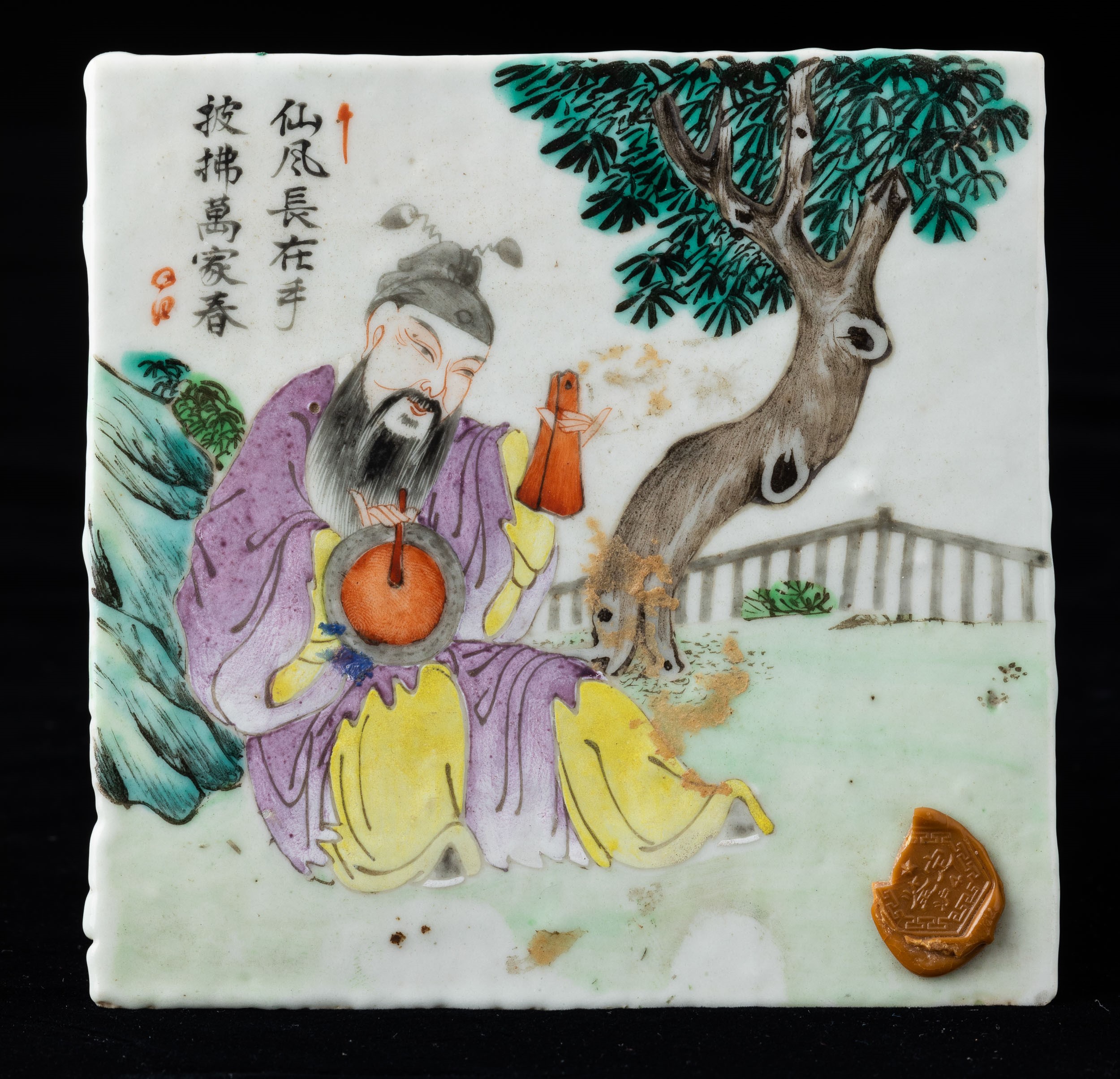 Piccola placca in porcellana raffigurante saggio entro paesaggio e iscrizione, Cina, [..]