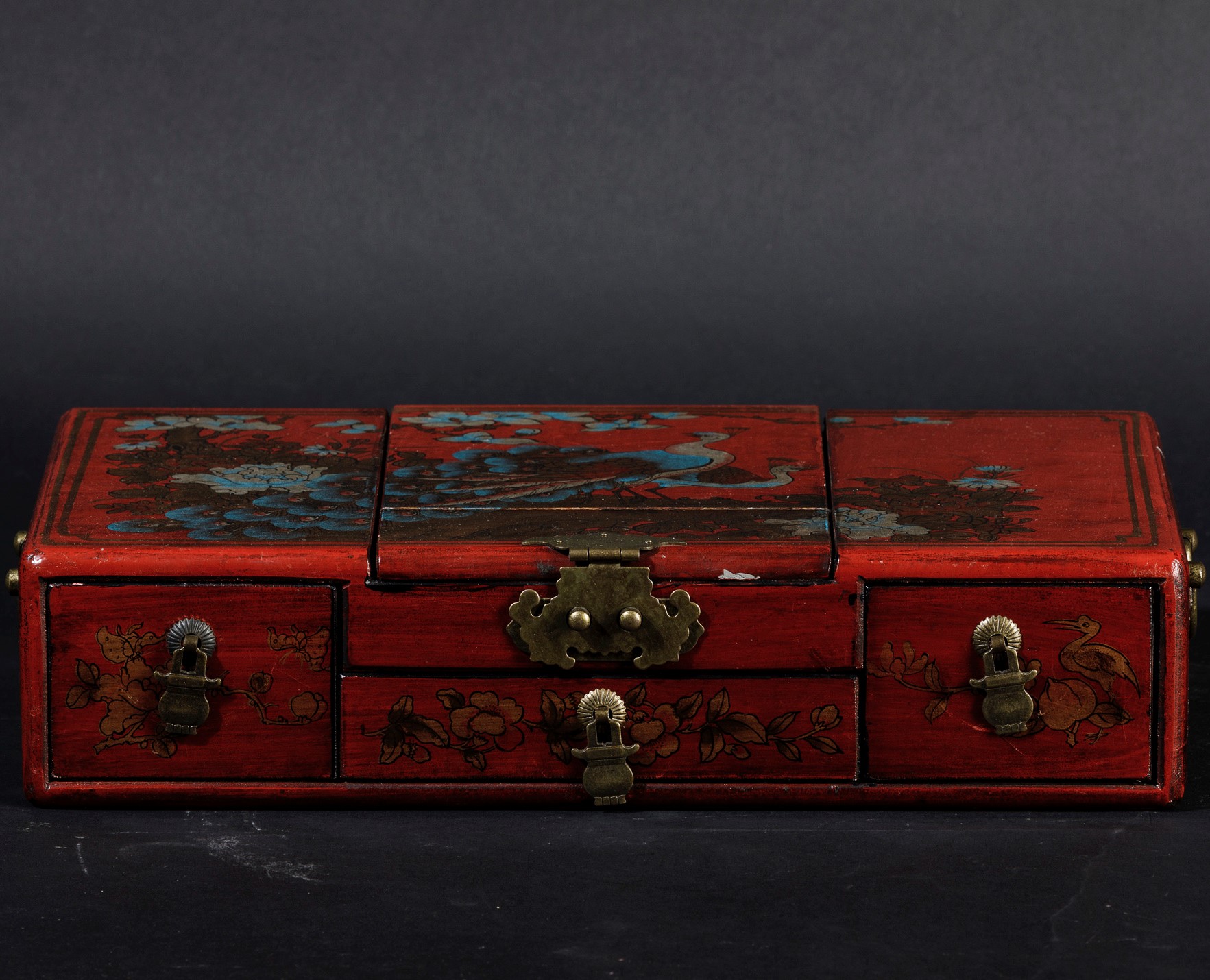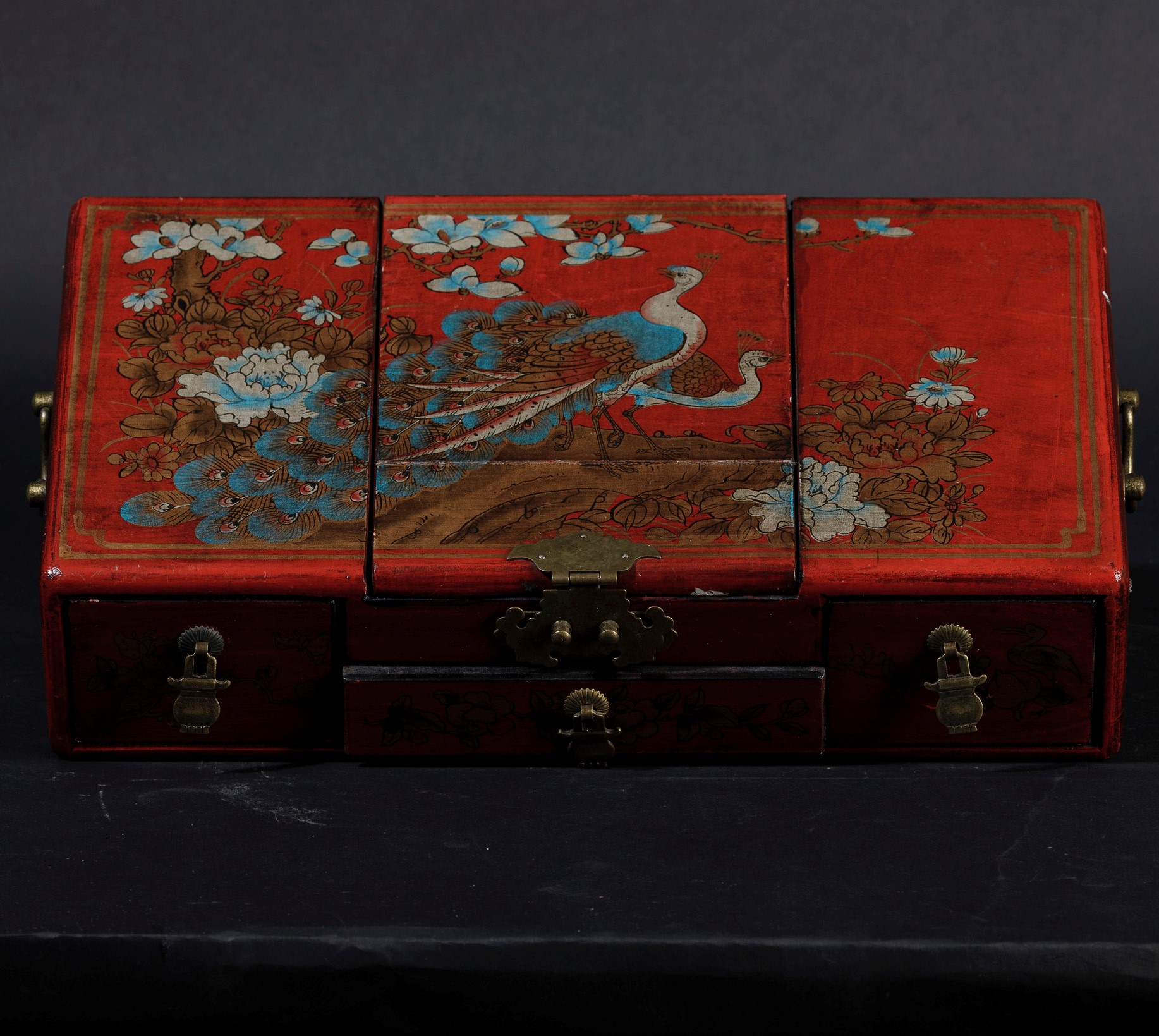 Piccola valigetta da viaggio in legno laccato con specchio e figure di pavoni, Cina, [..]