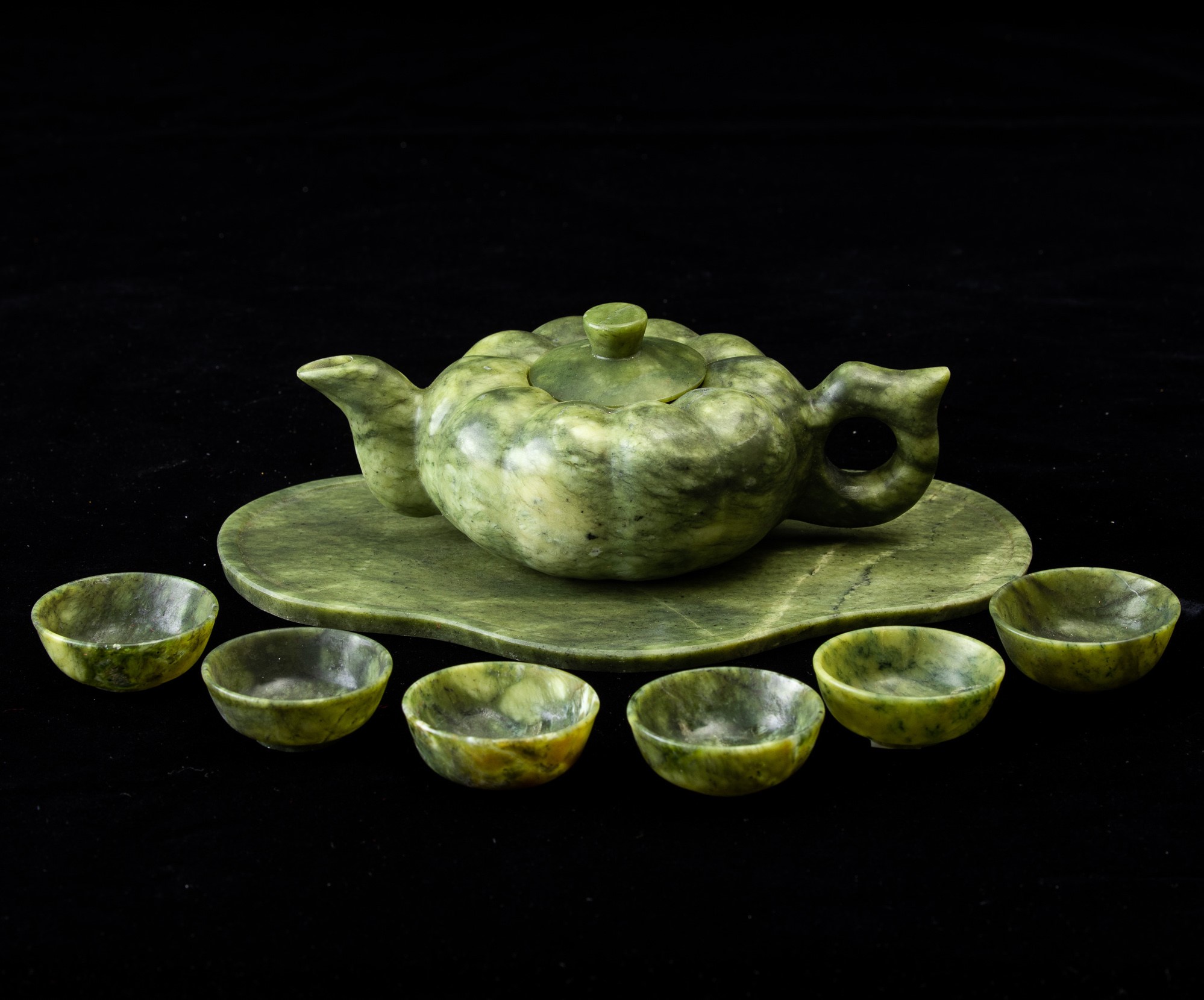 Set da thè scolpito in pietra verde composto da teiera, vassoio e sei tazzine, Cina, [..]
