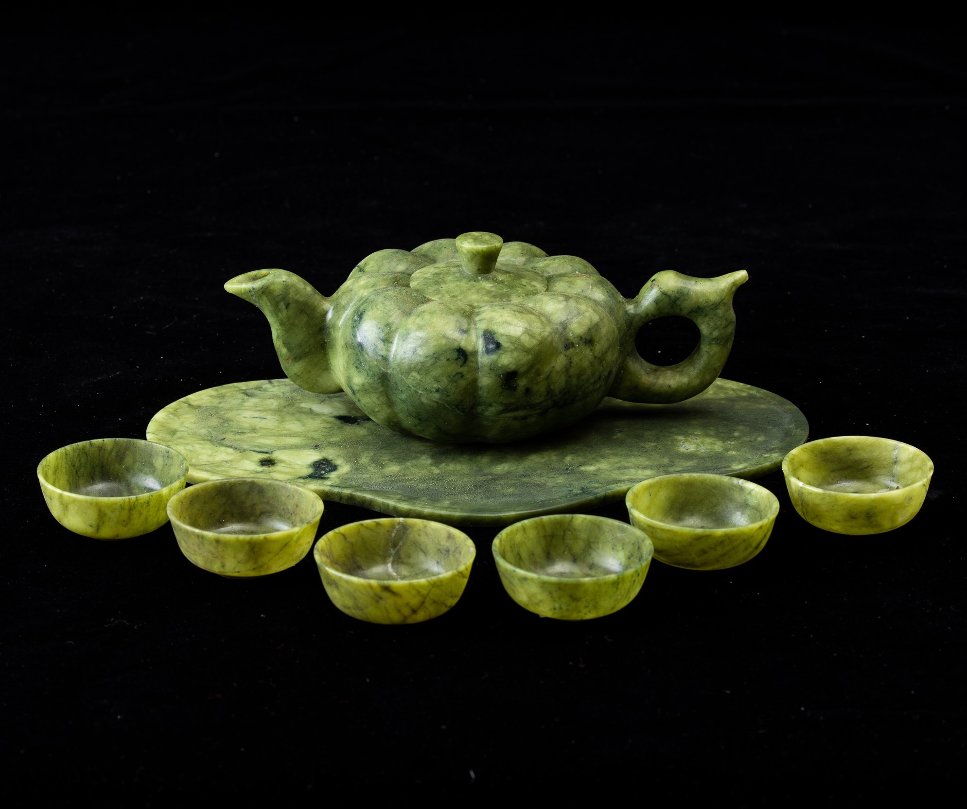 Set da thè scolpito in pietra verde composto da teiera, vassoio e sei tazzine, Cina, [..]