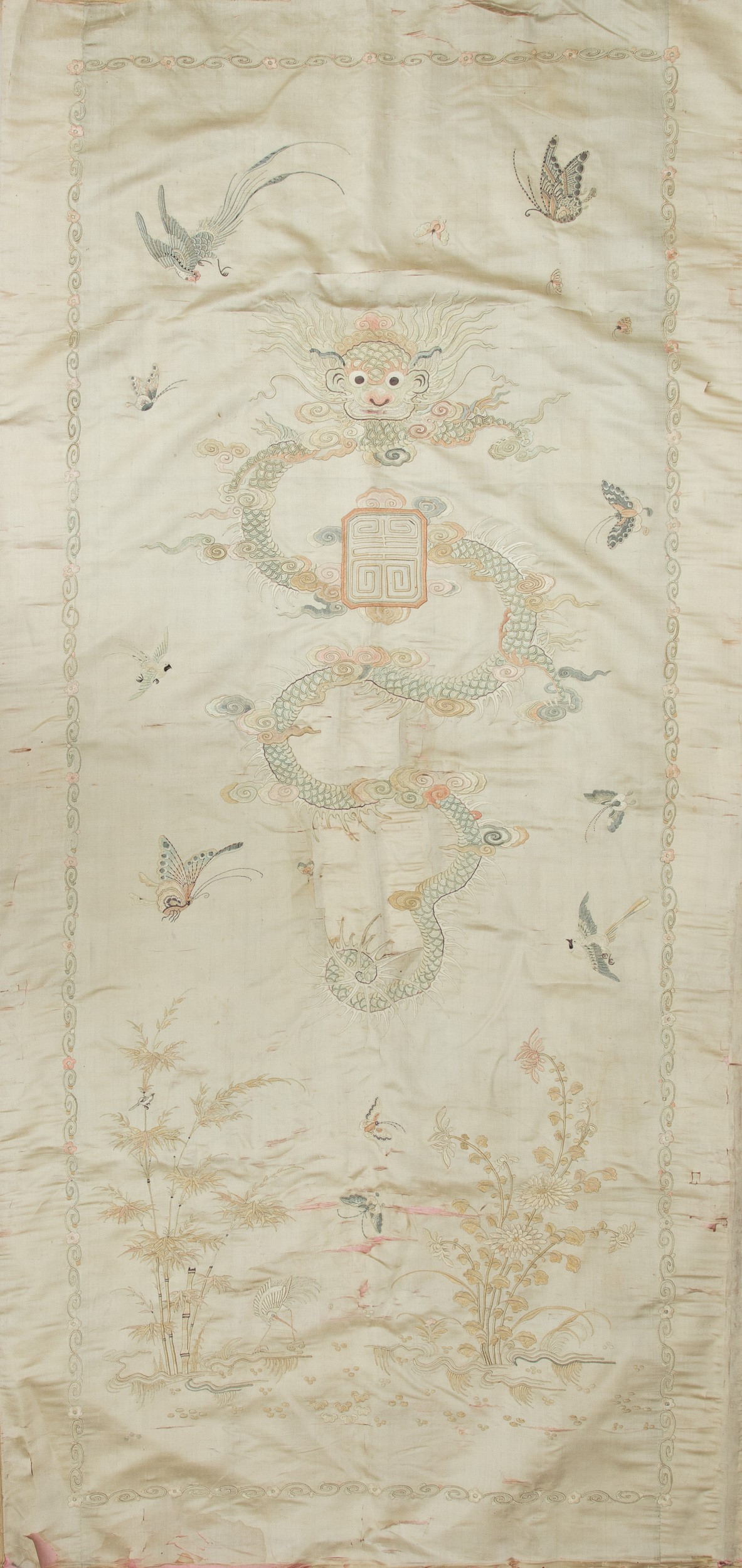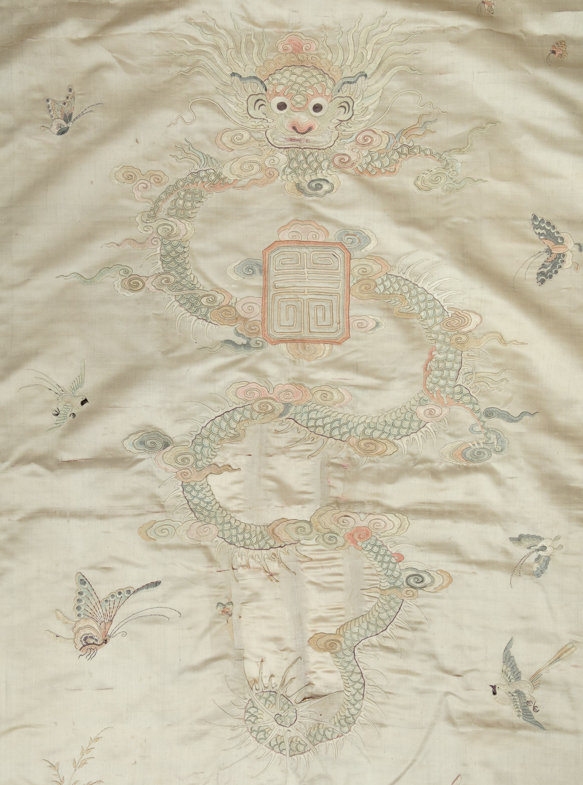 Tessuto in seta ricamata con figura di drago e fenici su fondo panna, Cina, Dinastia [..]