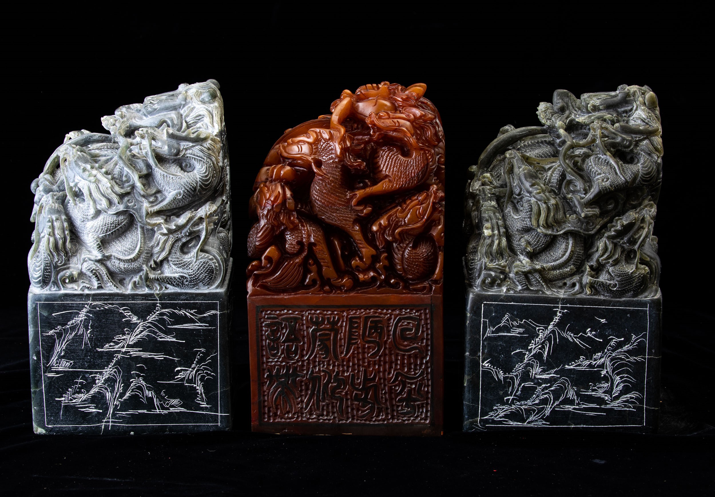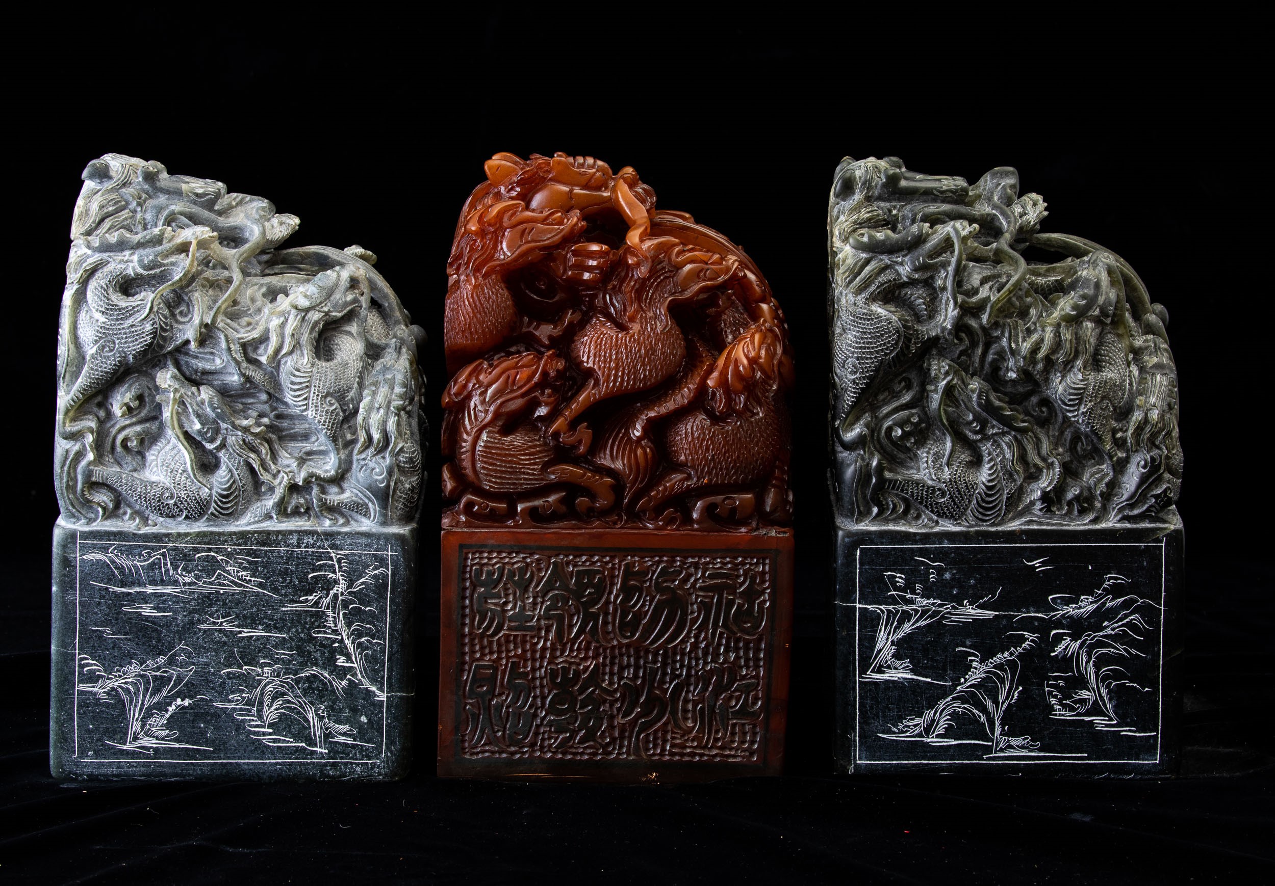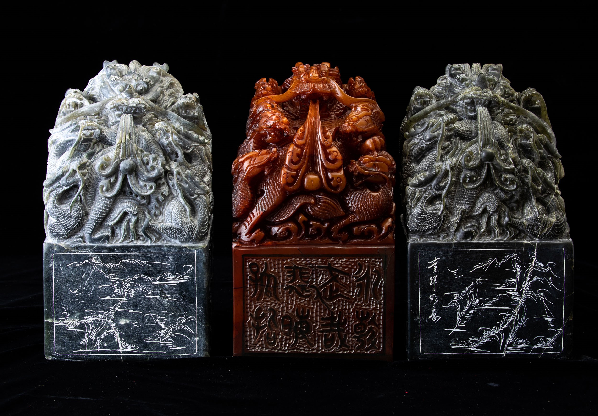 Tre sigilli scolpiti in pietra dura con draghi e iscrizioni, Cina, XX secolo