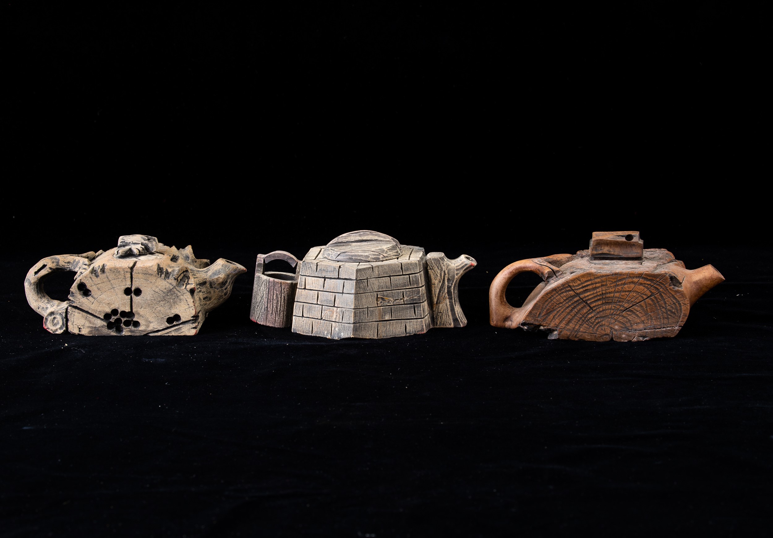 Tre teiere diverse in pietra, Cina, XX secolo