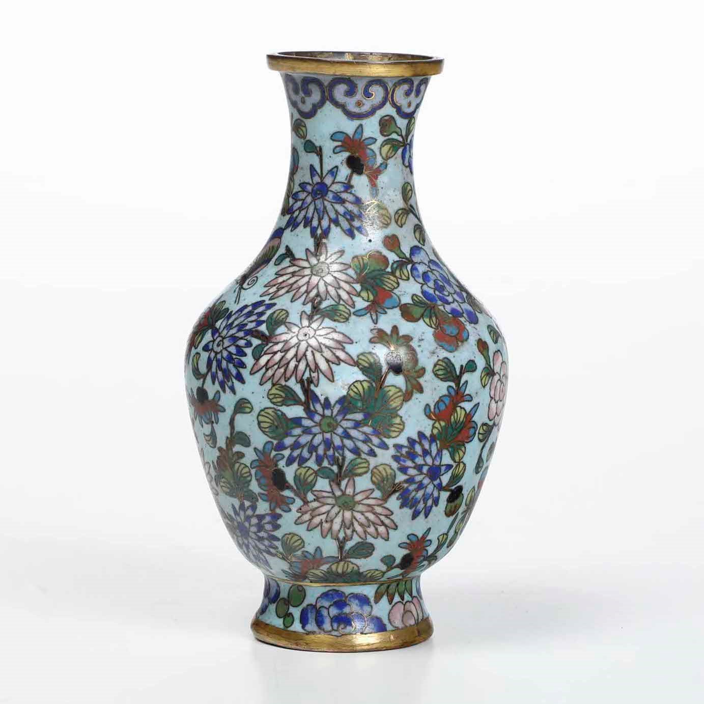 Vaso a smalti con decori floreali su fondo azzurro, Cina, XX secolo