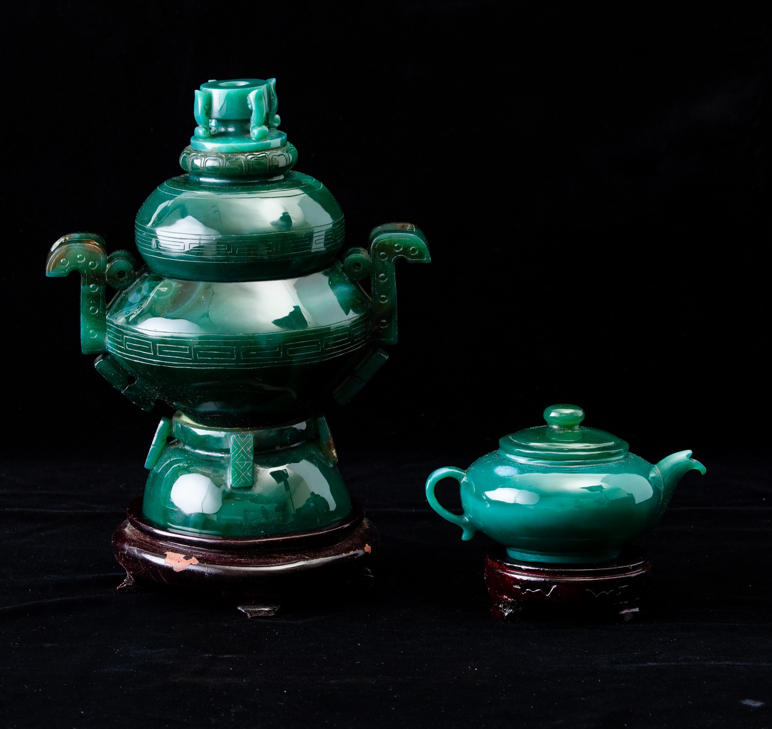 Vaso con coperchio e una teiera scolpiti in pietra dura verde, Cina, XX secolo