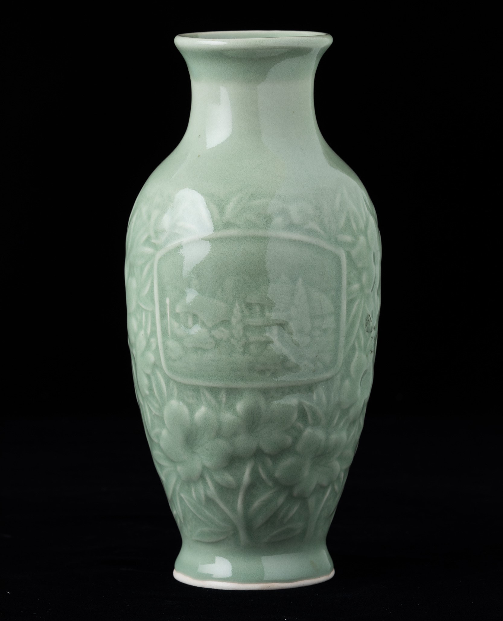 Vaso in porcellana monocroma Celadon con decori floreali e veduta di villaggio entro [..]