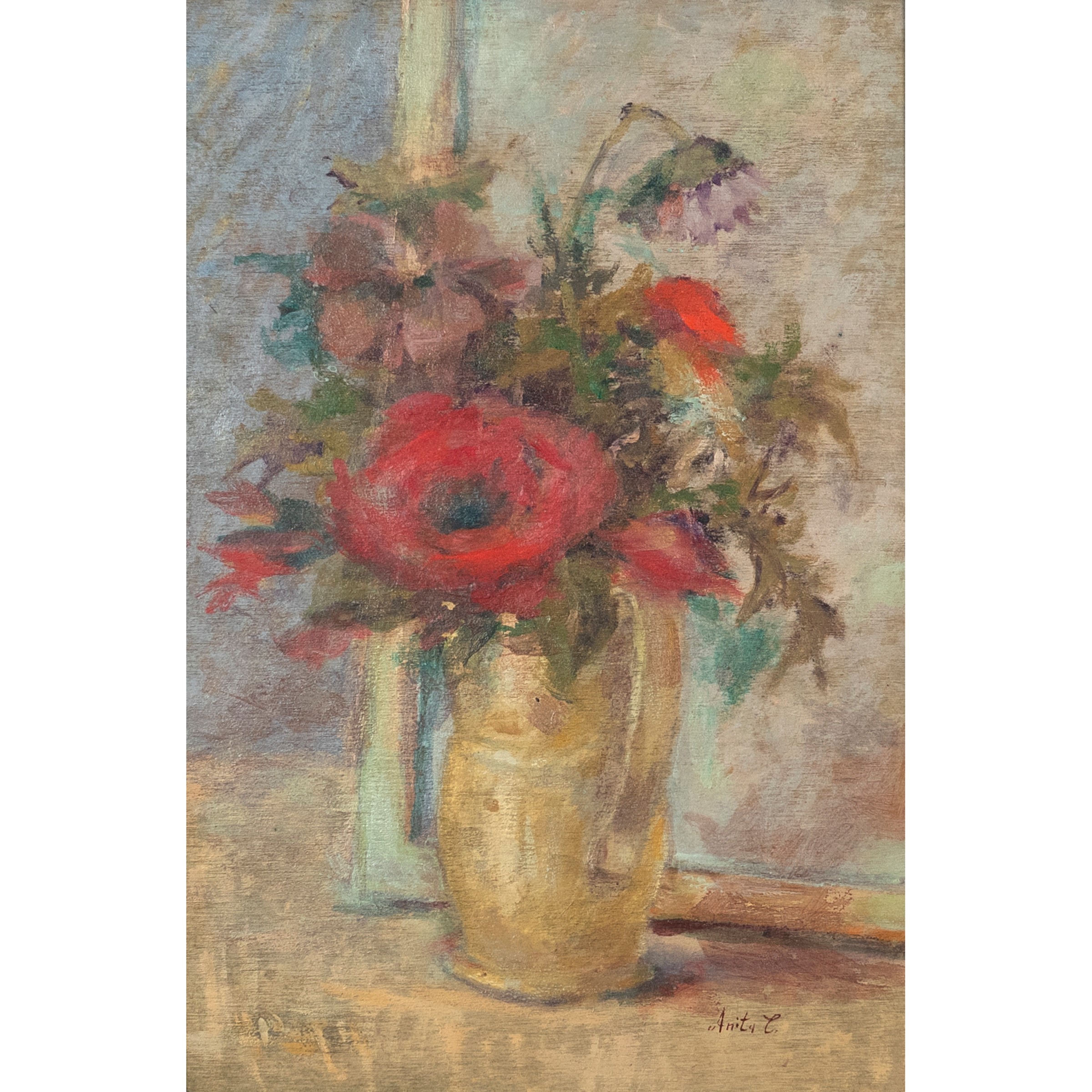Italia XX Sec. Caraffa con fiori, olio su tavola, firmato in basso a destra, entro cornice