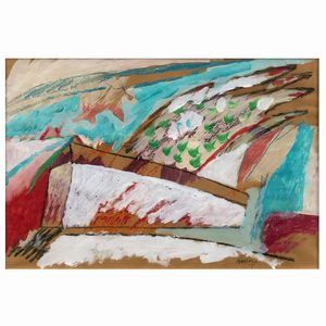 40x30 cm. La Spezia 1932 Paesaggio A/2, 1996, olio e collage su tela, firmato, datato e titolato sul retro, entro [..]