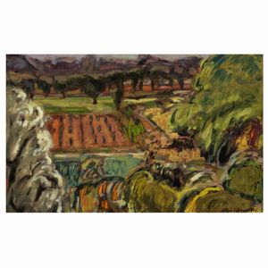 25x40 cm. Roma 1946 Campagna al vivaro, 1988, olio su cartoncino telato, firmato e datato in basso a destra, [..]