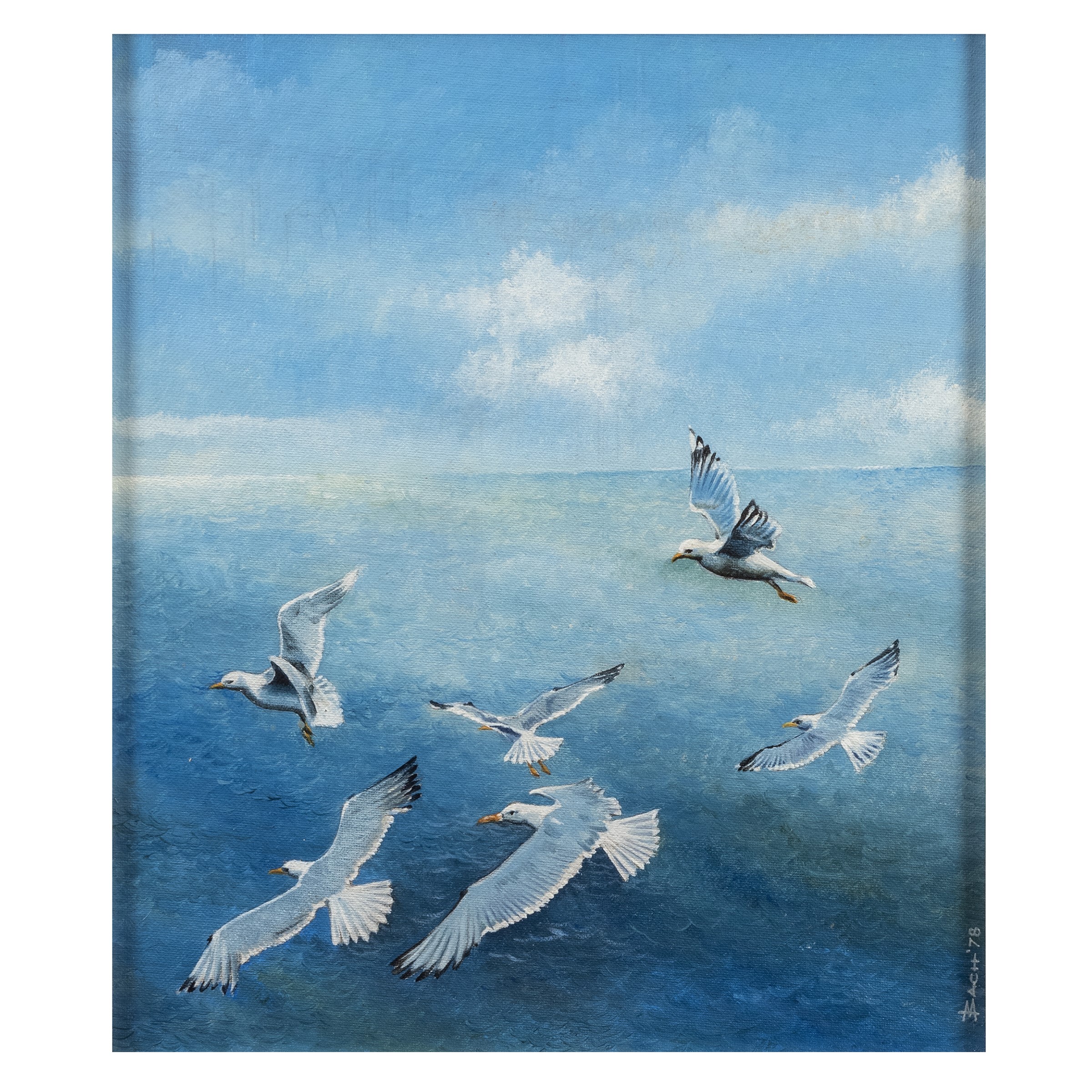 XX Sec. Gabbiani, 1978, olio su cartoncino telato, firmato e datato in basso a destra, entro cornice