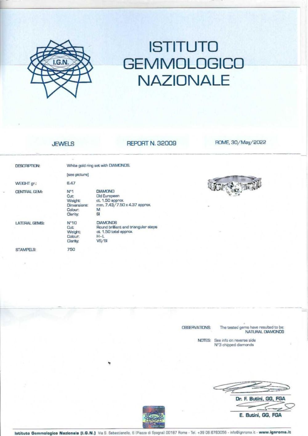 Anello in oro bianco 18kt con diamante centrale Old European per 1,50 ct ca, colore M, purezza SI. Diamanti laterali per 1,50 ct circa, colore H-L, purezza VS/SI. Peso complessivo 6,47 gr. Certificato gemmologico IGN n. 32009.