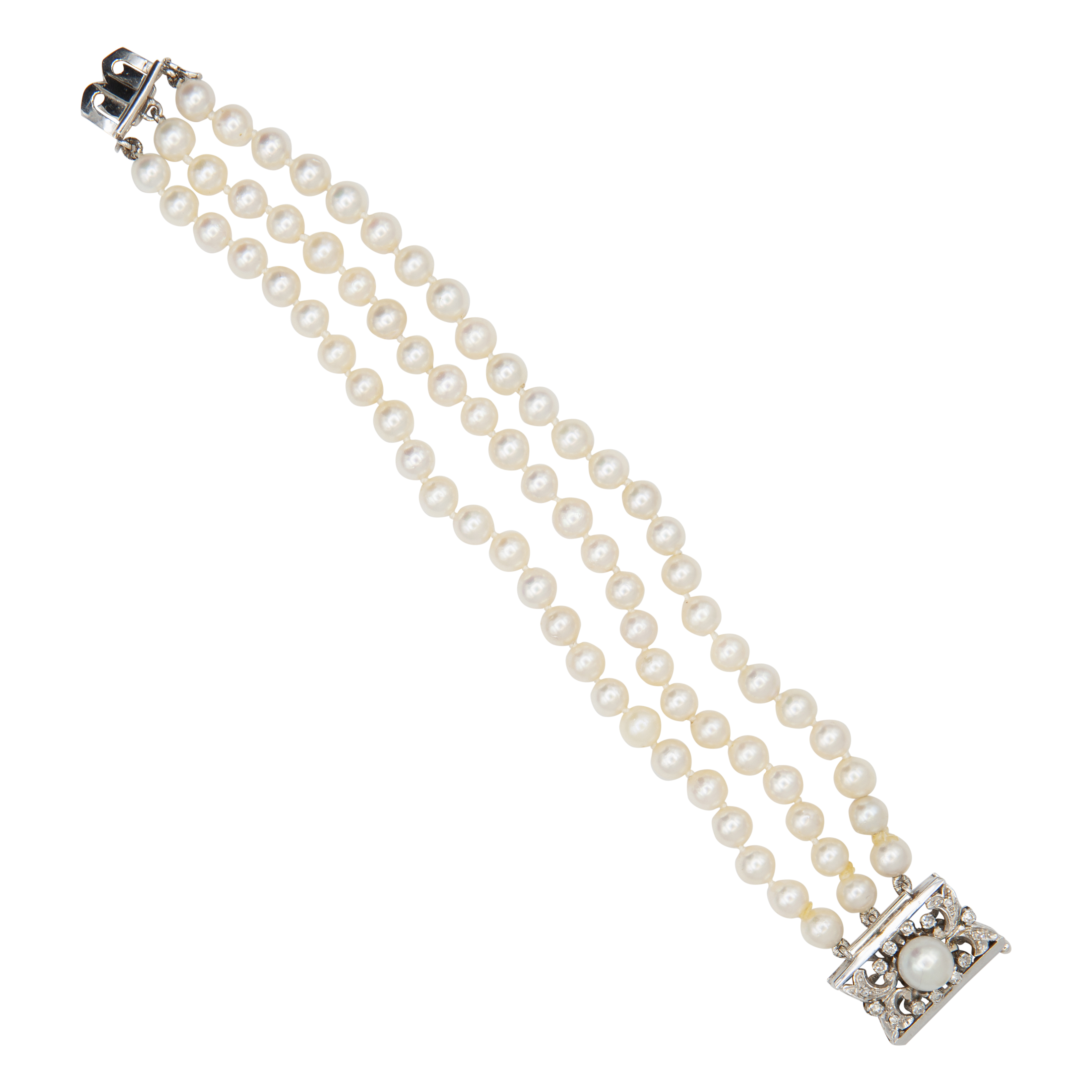 Bracciale con tre fili di perle, fermaglio in oro bianco 18kt con perla e brillanti. Lunghezza 15 cm. Peso 27,5 gr