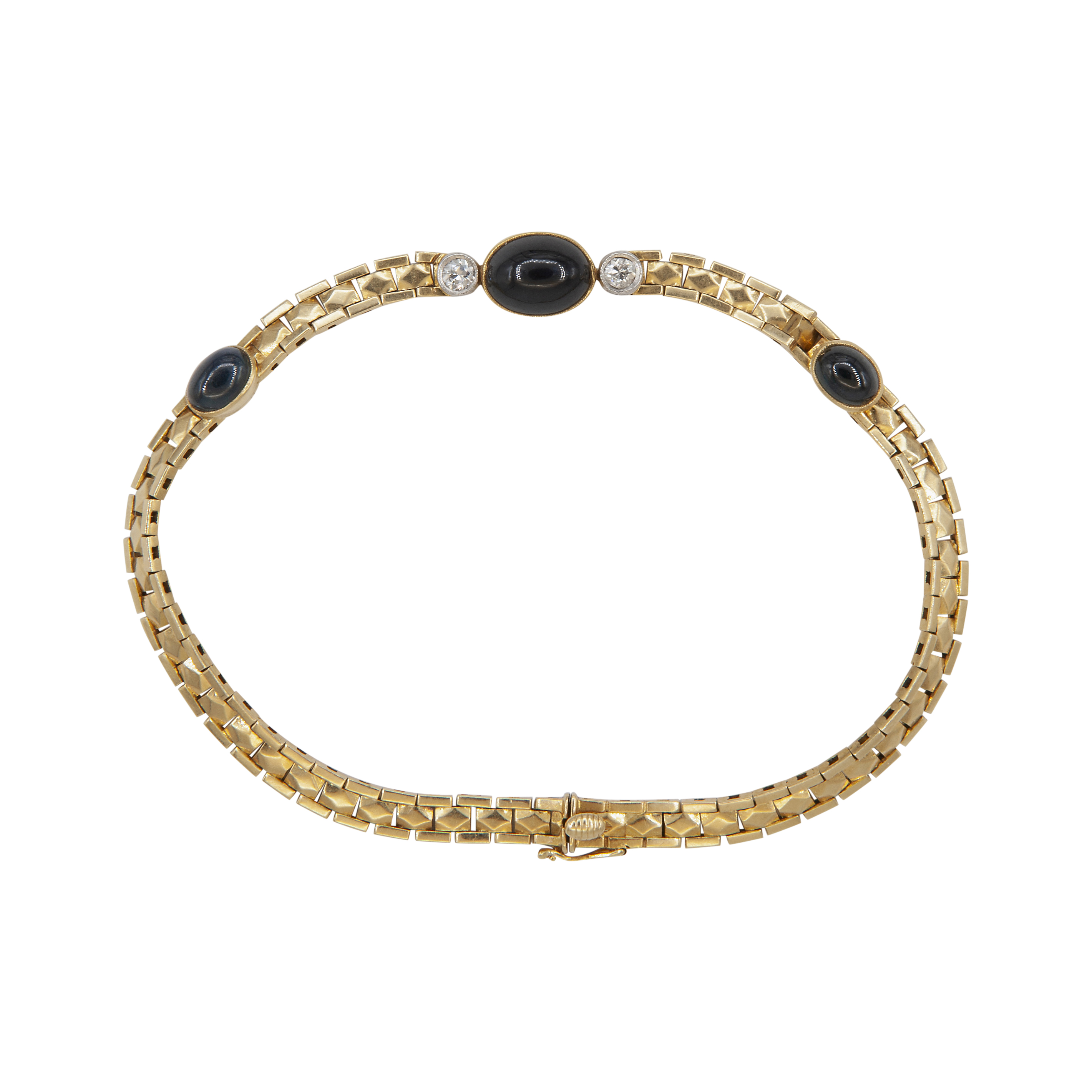 Bracciale in oro giallo 18kt con zaffiri cabochon e 2 piccoli diamanti. Lunghezza 20 cm. Peso complessivo 10,70 gr