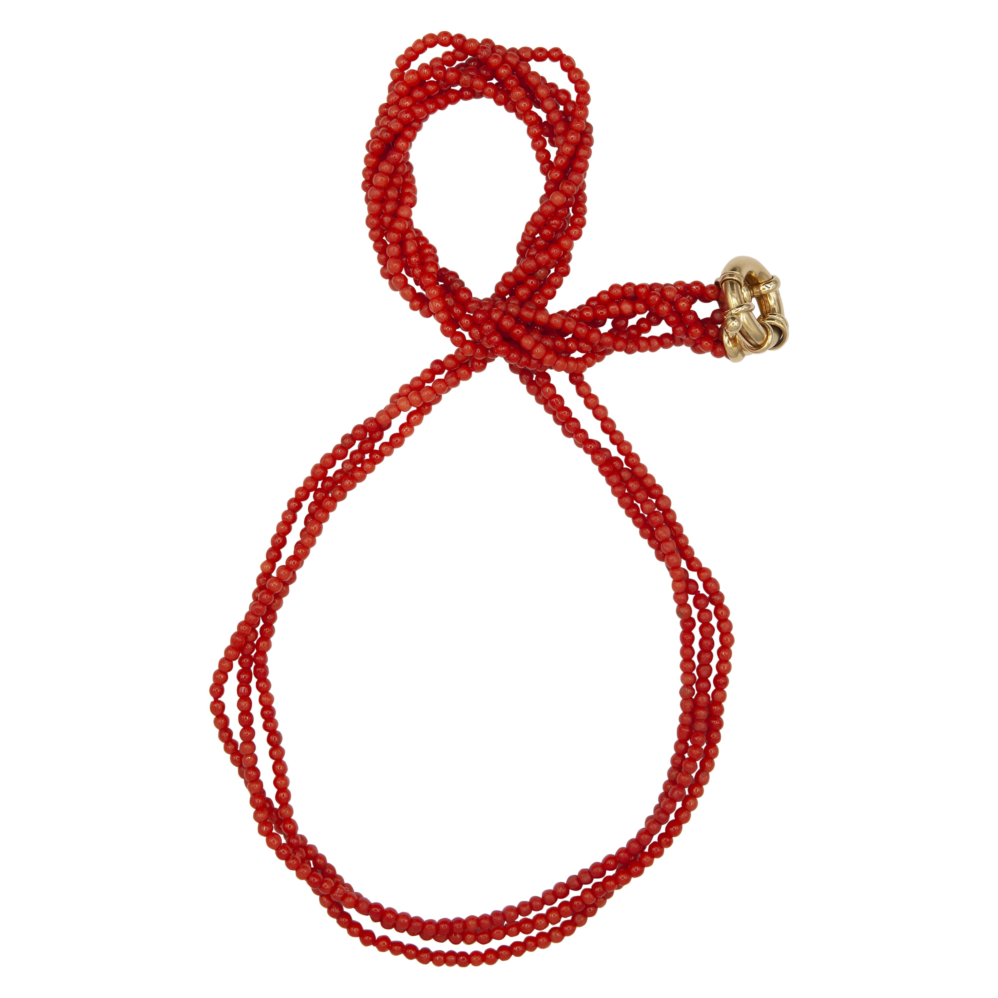 Collana tre fili di corallo rosso, chiusura in oro giallo 18kt. Fermaglio con corallo a motivo floreale. Lunghezza 75 cm. Peso 49,2 gr